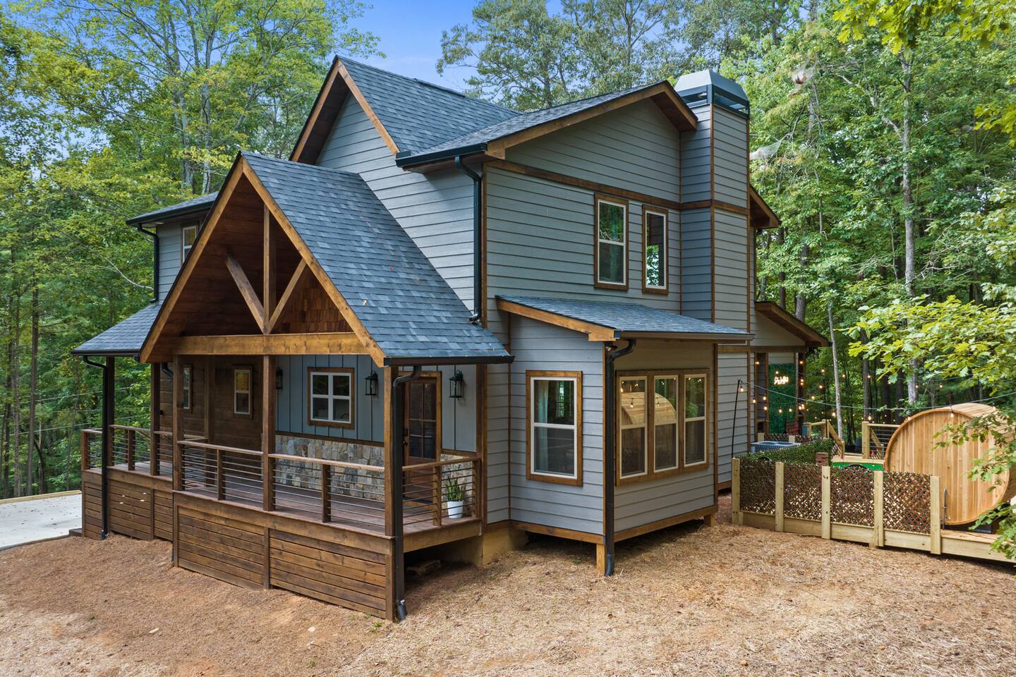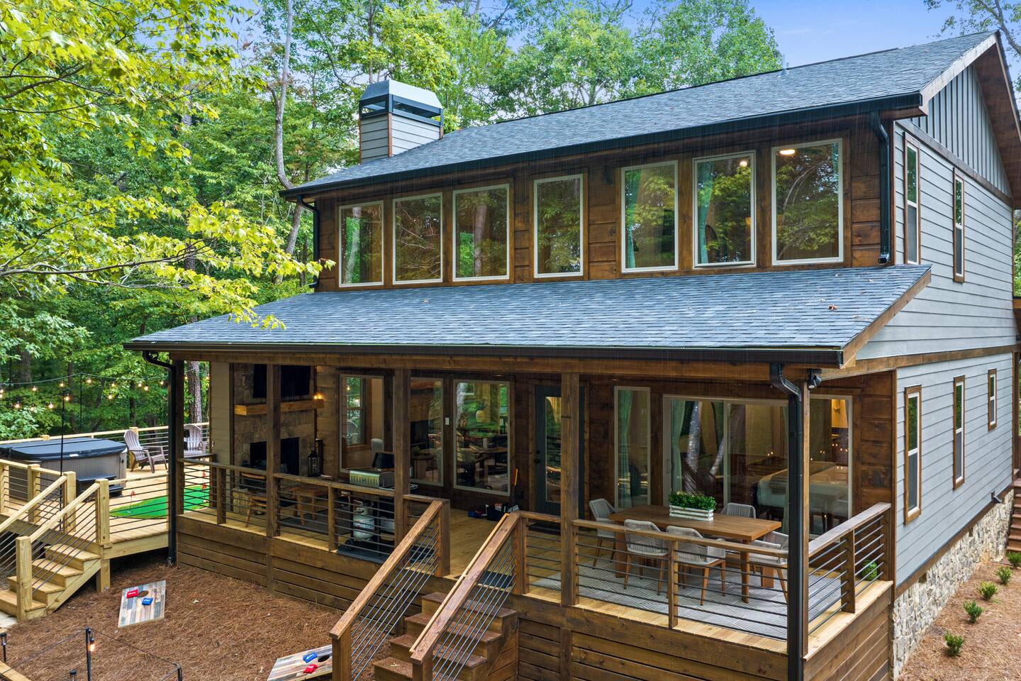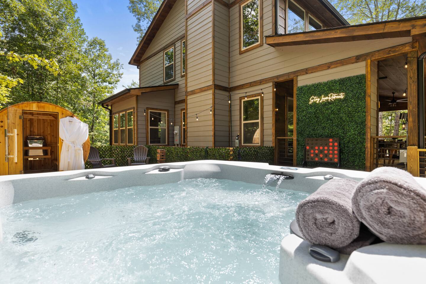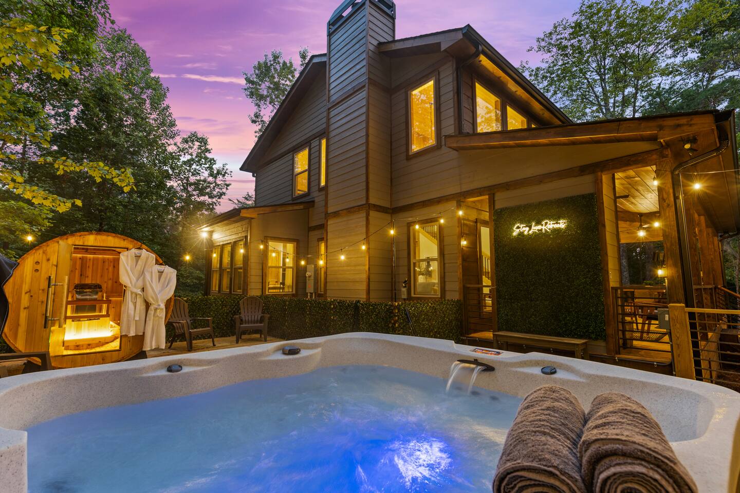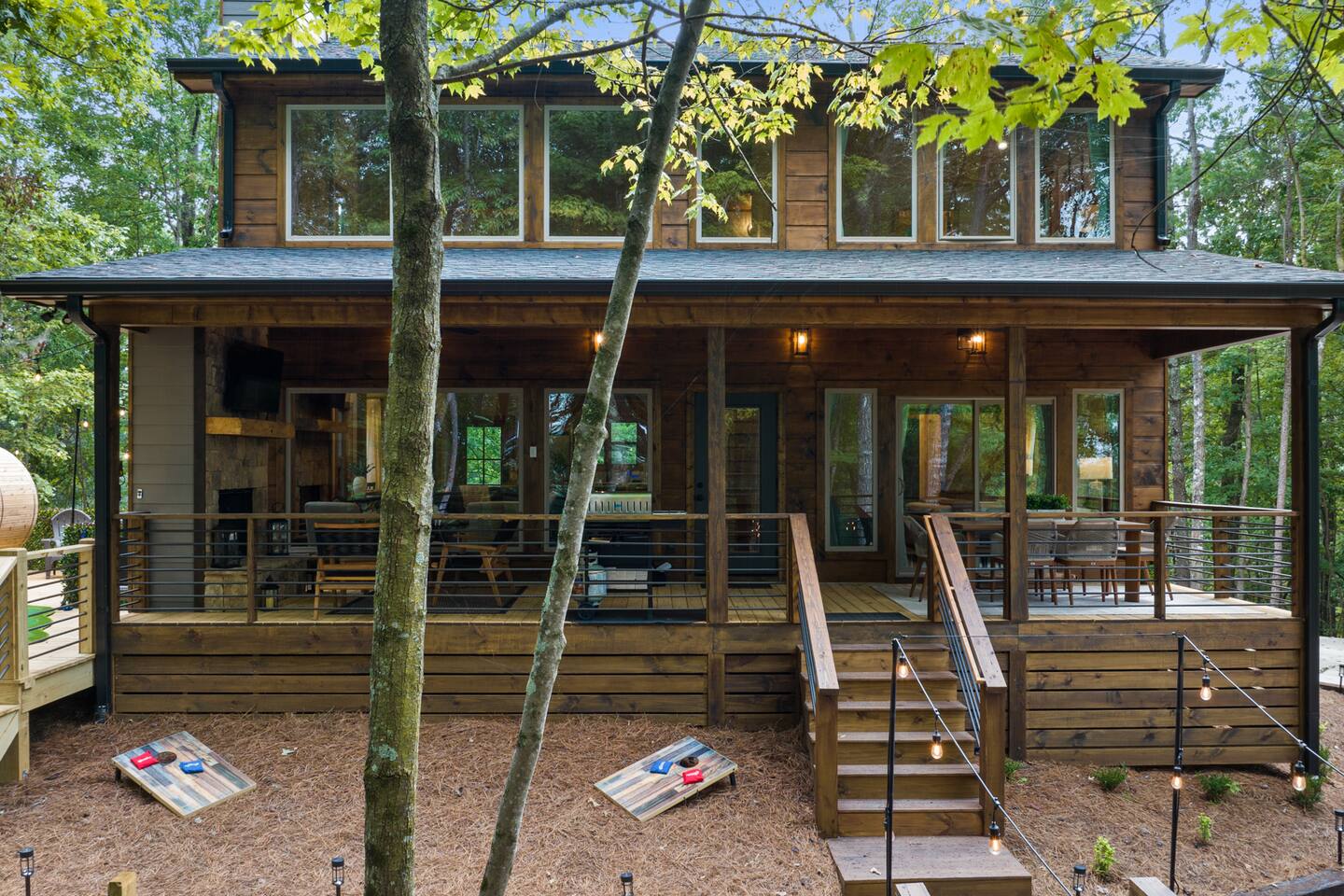 This brand-new luxury mountain retreat features 3 spacious bedrooms and 2.5 bathrooms, with comfortable sleeping arrangements including 2 king beds and 2 custom bunk beds — perfect for families, couples, or groups. Step outside to a thoughtfully designed high-end outdoor space that lets you enjoy the entire property. Cross the charming walking bridge to the fire pit, or relax on the expansive decks with a 6-person hot tub, barrel sauna, outdoor dining, fireplace lounge, and private putting green. Whether you’re gathering with loved ones or seeking new adventures, Serenity Escape offers the perfect blend of luxury and mountain adventure. Bedrooms - Bedroom 1 (First Floor – King Suite): King bed, private en-suite bathroom, and walk-in closet. Perfect for guests who prefer main-level access. - Bedroom 2 (Second Floor – King Room): King bed, dedicated workspace, walk-in closet, and access to a shared bathroom with a soaking tub and walk-in shower. - Bedroom 3 (Second Floor – Bunk Room): Two custom bunk beds, each with a full bed on the bottom, twin top bunk, and twin trundle — comfortably sleeping up to 6. Includes a cozy reading nook and shares the upstairs bathroom with Bedroom 2. Family-Friendly Amenities For our younger guests, you’ll find a high chair, booster seat, and pack ’n play in the downstairs hallway closet. The home is also equipped with children’s dishware, books, and toys to make family stays easy and fun. Back Porch and Amenities Deck The spacious back porch is the perfect place to relax and gather. Enjoy outdoor dining, fire up the gas grill with a full grilling set, or unwind in the beautiful lounge area in front of the outdoor fireplace with mounted TV — ideal for watching movies or catching the big game. Step onto the amenities deck along the side of the house, designed for both relaxation and fun. Here you’ll find plenty of seating, giant Jenga and Connect 5, plus wellness and entertainment features including a 6-person hot tub, barrel sauna, and private putting green. It’s the ultimate indoor-outdoor retreat for families and friends. Fire Pit Area Cross the charming walking bridge to enter the serene firepit space, designed for relaxation and connection. Gather around the large firepit with seating for 8, perfect for roasting marshmallows or enjoying conversations under the stars. On each side of the firepit, you’ll also find two wooden double-seat swings — a cozy spot to sway and soak in the mountain atmosphere. Location Serenity Escape is ideally located just 10 minutes from downtown Ellijay and 25 minutes from downtown Blue Ridge, giving you easy access to restaurants, wineries, apple orchards, hiking, horseback riding, and more. The cabin is nestled inside the gated Coosawattee River Resort, where guests enjoy complimentary access to resort-style amenities, including: - Tennis & pickleball courts - Indoor and outdoor swimming pools - Mini golf & arcade room - Fitness center - Fishing ponds & river access Whether you’re looking for outdoor adventure, family fun, or a relaxing wine country escape, this location puts it all within reach. Entertainment & TVs All TVs in the cabin are smart TVs with free access to movies, news, sports, and entertainment through Samsung TV Plus. Guests can also log in to their own streaming accounts such as Netflix, Hulu, Prime Video, Disney+, and more. Check out the house welcome book on the entry way piece to learn more about our property and local recommendations!