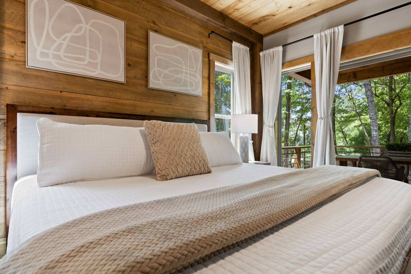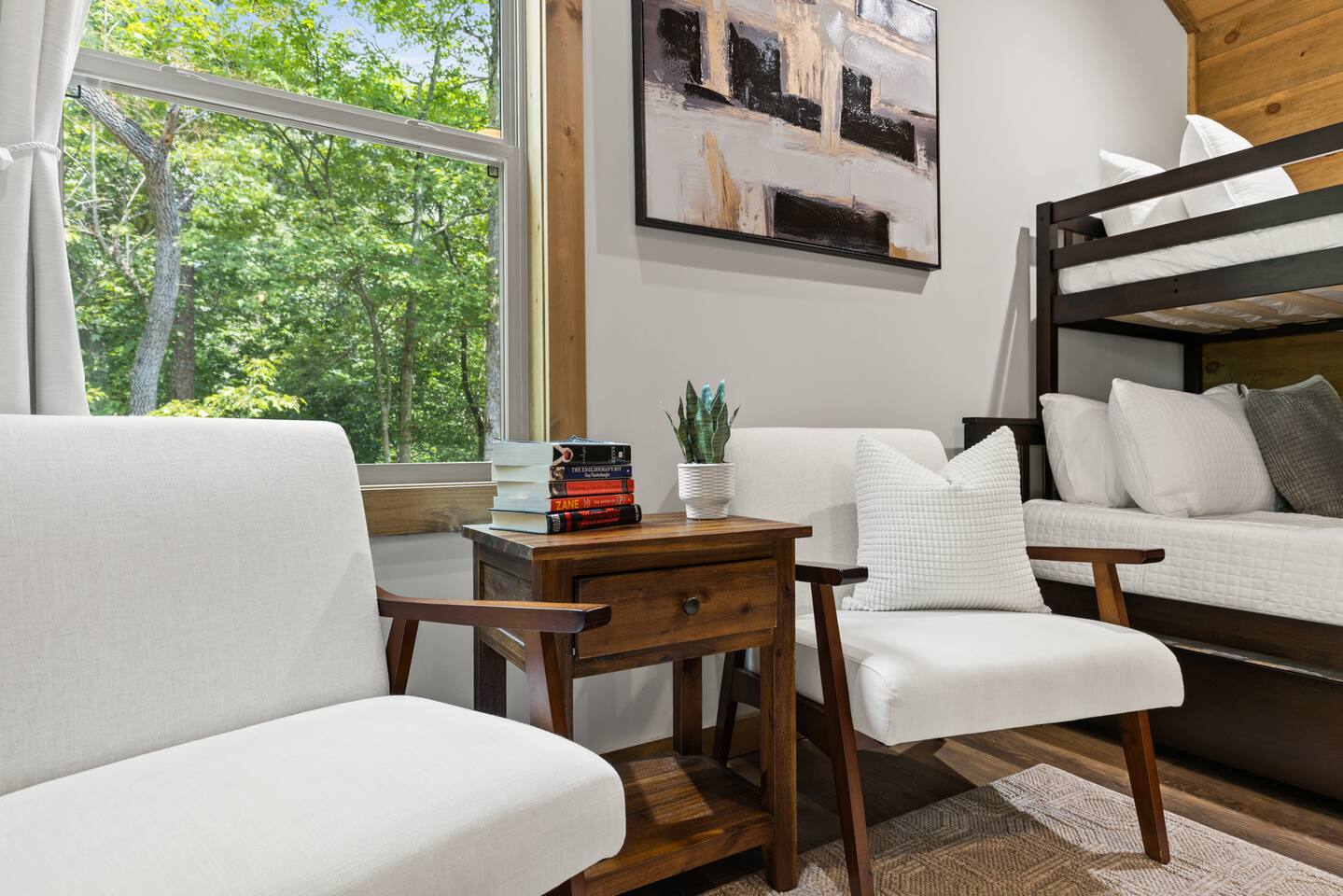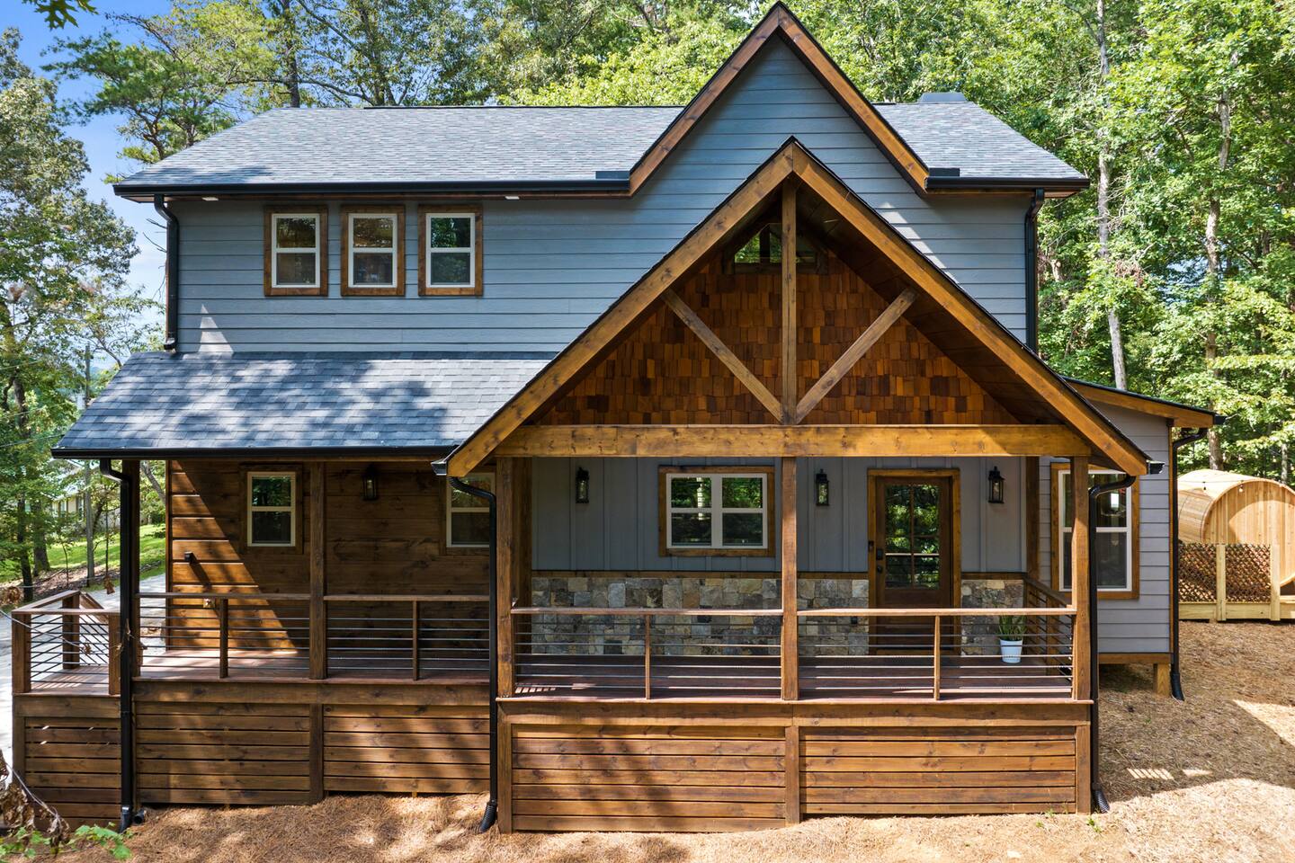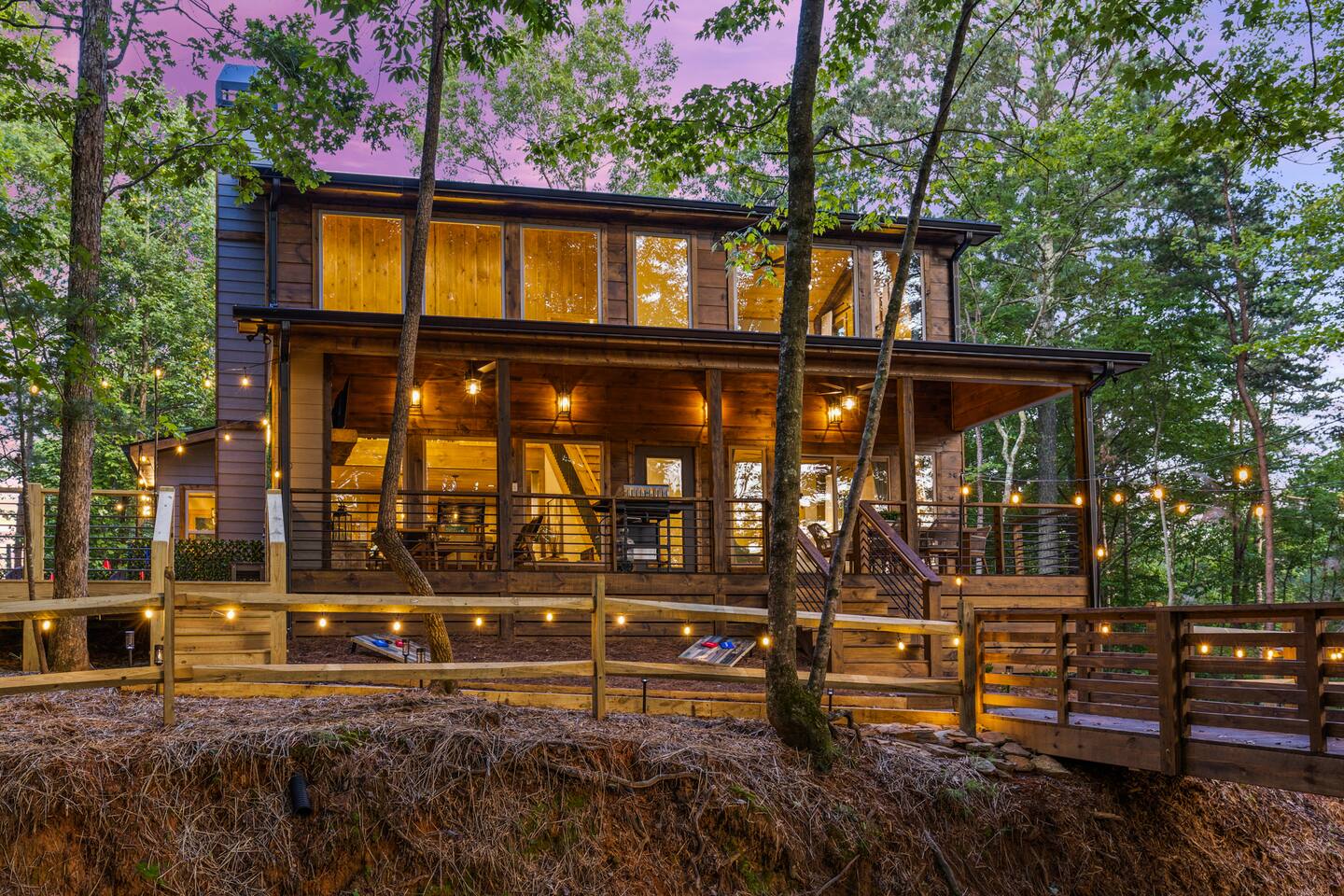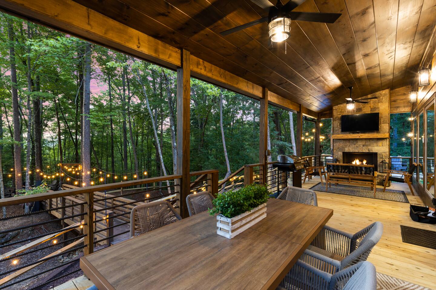 This brand-new luxury mountain retreat features 3 spacious bedrooms and 2.5 bathrooms, with comfortable sleeping arrangements including 2 king beds and 2 custom bunk beds — perfect for families, couples, or groups. Step outside to a thoughtfully designed high-end outdoor space that lets you enjoy the entire property. Cross the charming walking bridge to the fire pit, or relax on the expansive decks with a 6-person hot tub, barrel sauna, outdoor dining, fireplace lounge, and private putting green. Whether you’re gathering with loved ones or seeking new adventures, Serenity Escape offers the perfect blend of luxury and mountain adventure. Bedrooms - Bedroom 1 (First Floor – King Suite): King bed, private en-suite bathroom, and walk-in closet. Perfect for guests who prefer main-level access. - Bedroom 2 (Second Floor – King Room): King bed, dedicated workspace, walk-in closet, and access to a shared bathroom with a soaking tub and walk-in shower. - Bedroom 3 (Second Floor – Bunk Room): Two custom bunk beds, each with a full bed on the bottom, twin top bunk, and twin trundle — comfortably sleeping up to 6. Includes a cozy reading nook and shares the upstairs bathroom with Bedroom 2. Family-Friendly Amenities For our younger guests, you’ll find a high chair, booster seat, and pack ’n play in the downstairs hallway closet. The home is also equipped with children’s dishware, books, and toys to make family stays easy and fun. Back Porch and Amenities Deck The spacious back porch is the perfect place to relax and gather. Enjoy outdoor dining, fire up the gas grill with a full grilling set, or unwind in the beautiful lounge area in front of the outdoor fireplace with mounted TV — ideal for watching movies or catching the big game. Step onto the amenities deck along the side of the house, designed for both relaxation and fun. Here you’ll find plenty of seating, giant Jenga and Connect 5, plus wellness and entertainment features including a 6-person hot tub, barrel sauna, and private putting green. It’s the ultimate indoor-outdoor retreat for families and friends. Fire Pit Area Cross the charming walking bridge to enter the serene firepit space, designed for relaxation and connection. Gather around the large firepit with seating for 8, perfect for roasting marshmallows or enjoying conversations under the stars. On each side of the firepit, you’ll also find two wooden double-seat swings — a cozy spot to sway and soak in the mountain atmosphere. Location Serenity Escape is ideally located just 10 minutes from downtown Ellijay and 25 minutes from downtown Blue Ridge, giving you easy access to restaurants, wineries, apple orchards, hiking, horseback riding, and more. The cabin is nestled inside the gated Coosawattee River Resort, where guests enjoy complimentary access to resort-style amenities, including: - Tennis & pickleball courts - Indoor and outdoor swimming pools - Mini golf & arcade room - Fitness center - Fishing ponds & river access Whether you’re looking for outdoor adventure, family fun, or a relaxing wine country escape, this location puts it all within reach. Entertainment & TVs All TVs in the cabin are smart TVs with free access to movies, news, sports, and entertainment through Samsung TV Plus. Guests can also log in to their own streaming accounts such as Netflix, Hulu, Prime Video, Disney+, and more. Check out the house welcome book on the entry way piece to learn more about our property and local recommendations!