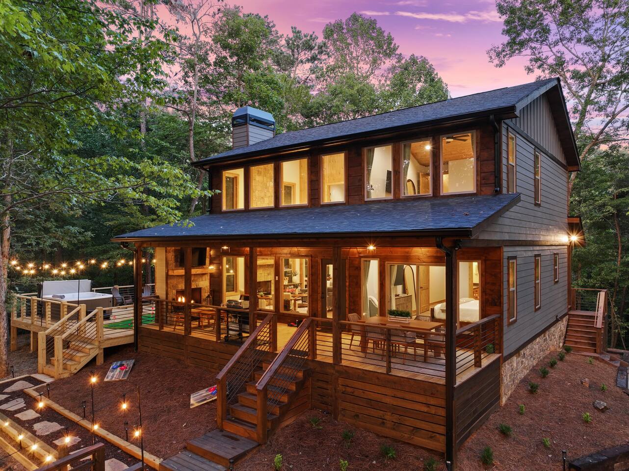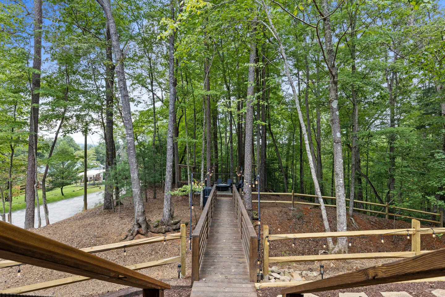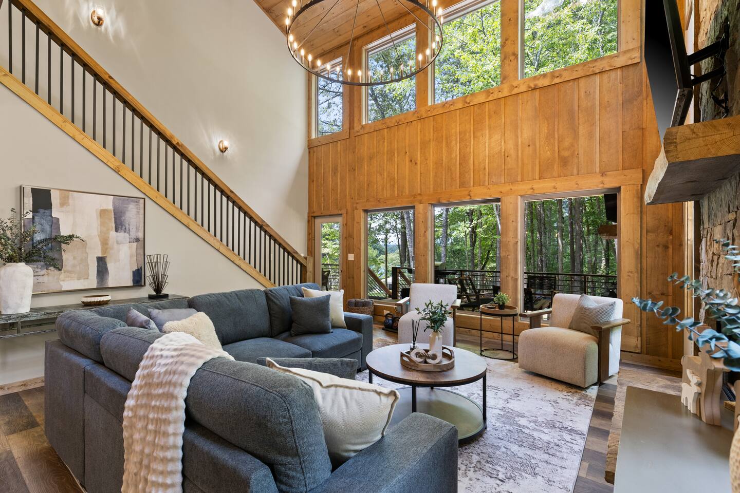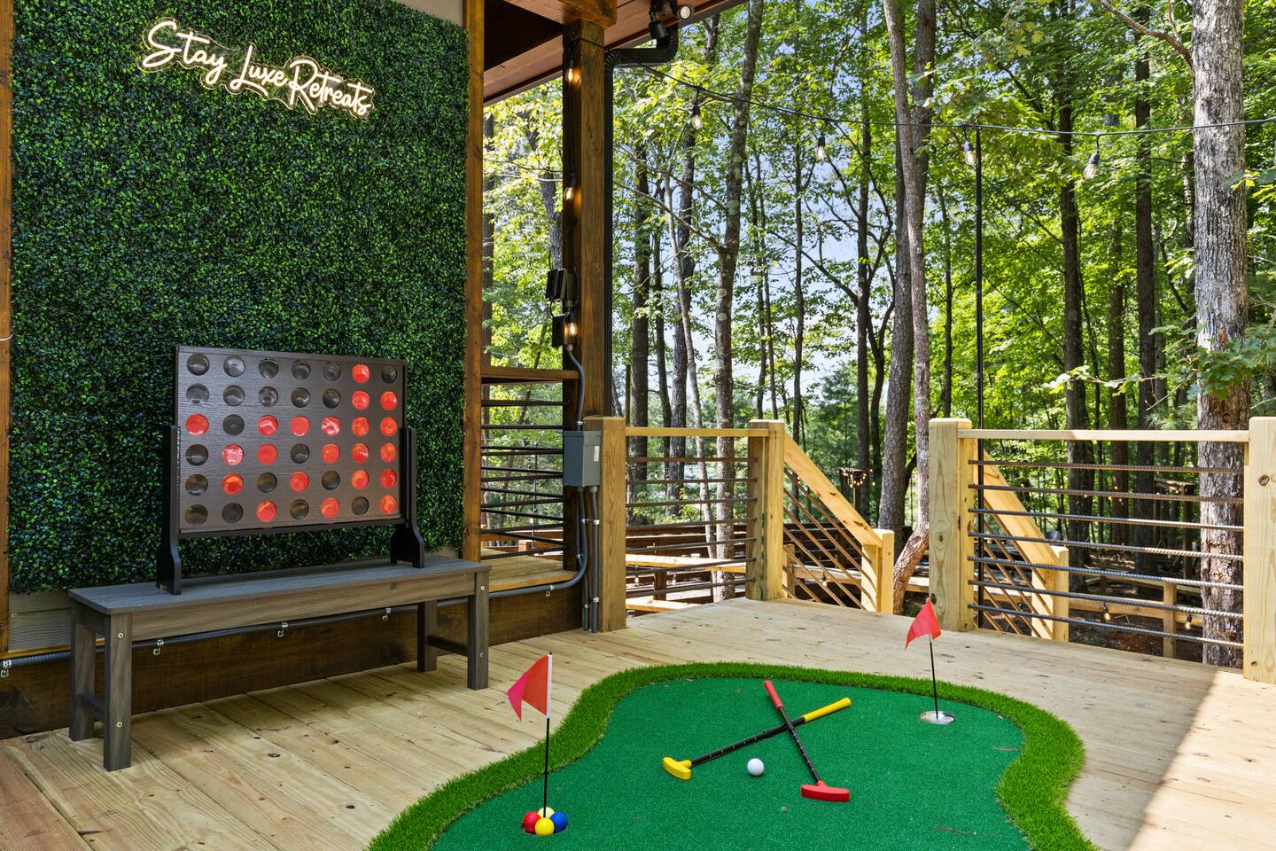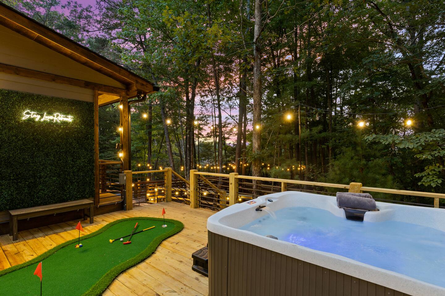 This brand-new luxury mountain retreat features 3 spacious bedrooms and 2.5 bathrooms, with comfortable sleeping arrangements including 2 king beds and 2 custom bunk beds — perfect for families, couples, or groups. Step outside to a thoughtfully designed high-end outdoor space that lets you enjoy the entire property. Cross the charming walking bridge to the fire pit, or relax on the expansive decks with a 6-person hot tub, barrel sauna, outdoor dining, fireplace lounge, and private putting green. Whether you’re gathering with loved ones or seeking new adventures, Serenity Escape offers the perfect blend of luxury and mountain adventure. Bedrooms - Bedroom 1 (First Floor – King Suite): King bed, private en-suite bathroom, and walk-in closet. Perfect for guests who prefer main-level access. - Bedroom 2 (Second Floor – King Room): King bed, dedicated workspace, walk-in closet, and access to a shared bathroom with a soaking tub and walk-in shower. - Bedroom 3 (Second Floor – Bunk Room): Two custom bunk beds, each with a full bed on the bottom, twin top bunk, and twin trundle — comfortably sleeping up to 6. Includes a cozy reading nook and shares the upstairs bathroom with Bedroom 2. Family-Friendly Amenities For our younger guests, you’ll find a high chair, booster seat, and pack ’n play in the downstairs hallway closet. The home is also equipped with children’s dishware, books, and toys to make family stays easy and fun. Back Porch and Amenities Deck The spacious back porch is the perfect place to relax and gather. Enjoy outdoor dining, fire up the gas grill with a full grilling set, or unwind in the beautiful lounge area in front of the outdoor fireplace with mounted TV — ideal for watching movies or catching the big game. Step onto the amenities deck along the side of the house, designed for both relaxation and fun. Here you’ll find plenty of seating, giant Jenga and Connect 5, plus wellness and entertainment features including a 6-person hot tub, barrel sauna, and private putting green. It’s the ultimate indoor-outdoor retreat for families and friends. Fire Pit Area Cross the charming walking bridge to enter the serene firepit space, designed for relaxation and connection. Gather around the large firepit with seating for 8, perfect for roasting marshmallows or enjoying conversations under the stars. On each side of the firepit, you’ll also find two wooden double-seat swings — a cozy spot to sway and soak in the mountain atmosphere. Location Serenity Escape is ideally located just 10 minutes from downtown Ellijay and 25 minutes from downtown Blue Ridge, giving you easy access to restaurants, wineries, apple orchards, hiking, horseback riding, and more. The cabin is nestled inside the gated Coosawattee River Resort, where guests enjoy complimentary access to resort-style amenities, including: - Tennis & pickleball courts - Indoor and outdoor swimming pools - Mini golf & arcade room - Fitness center - Fishing ponds & river access Whether you’re looking for outdoor adventure, family fun, or a relaxing wine country escape, this location puts it all within reach. Entertainment & TVs All TVs in the cabin are smart TVs with free access to movies, news, sports, and entertainment through Samsung TV Plus. Guests can also log in to their own streaming accounts such as Netflix, Hulu, Prime Video, Disney+, and more. Check out the house welcome book on the entry way piece to learn more about our property and local recommendations!