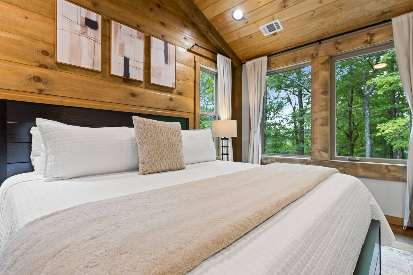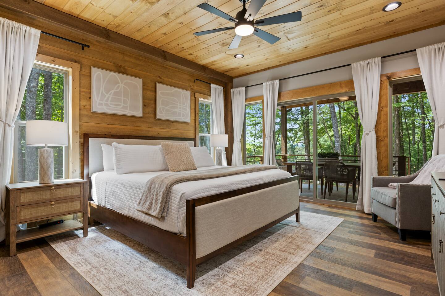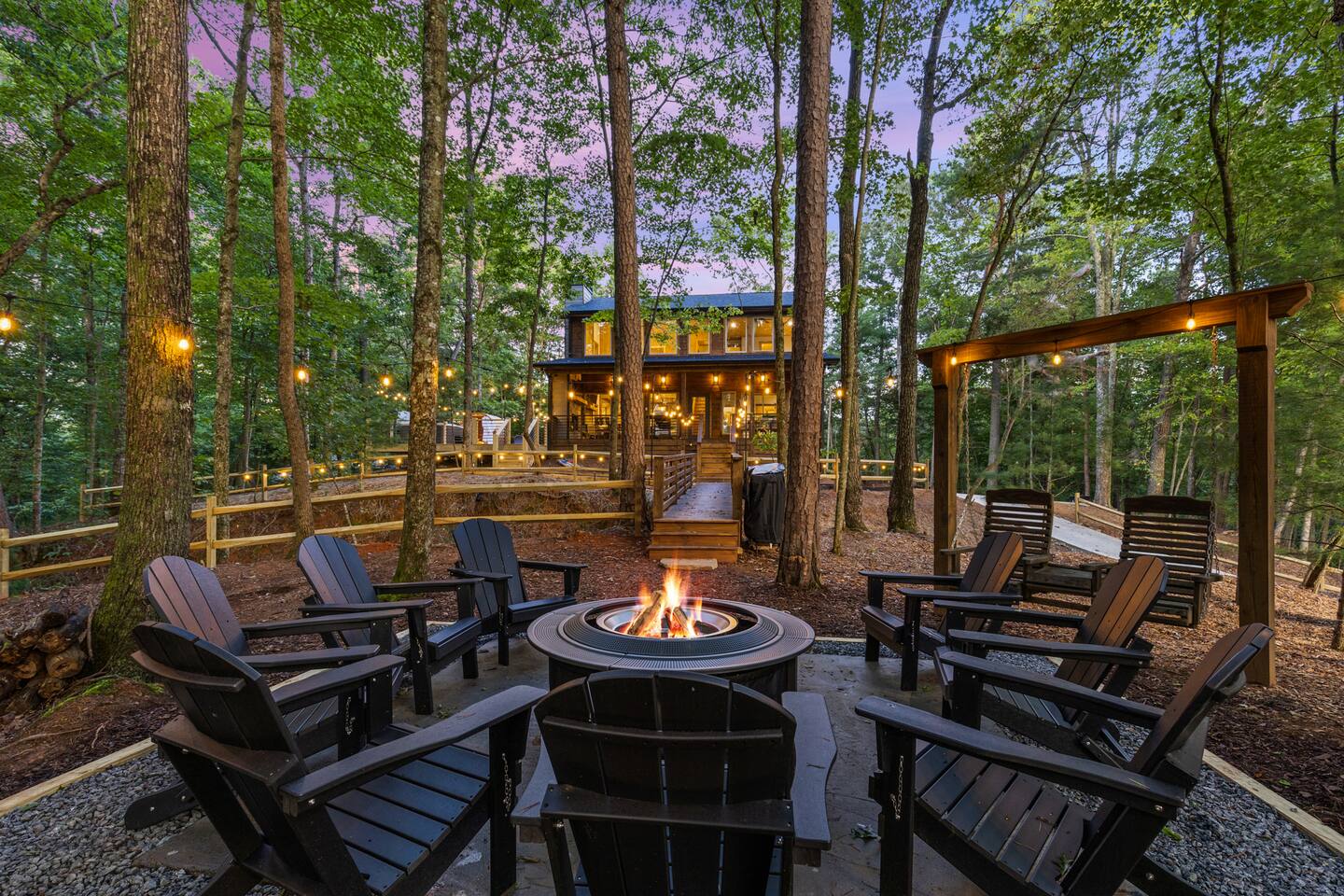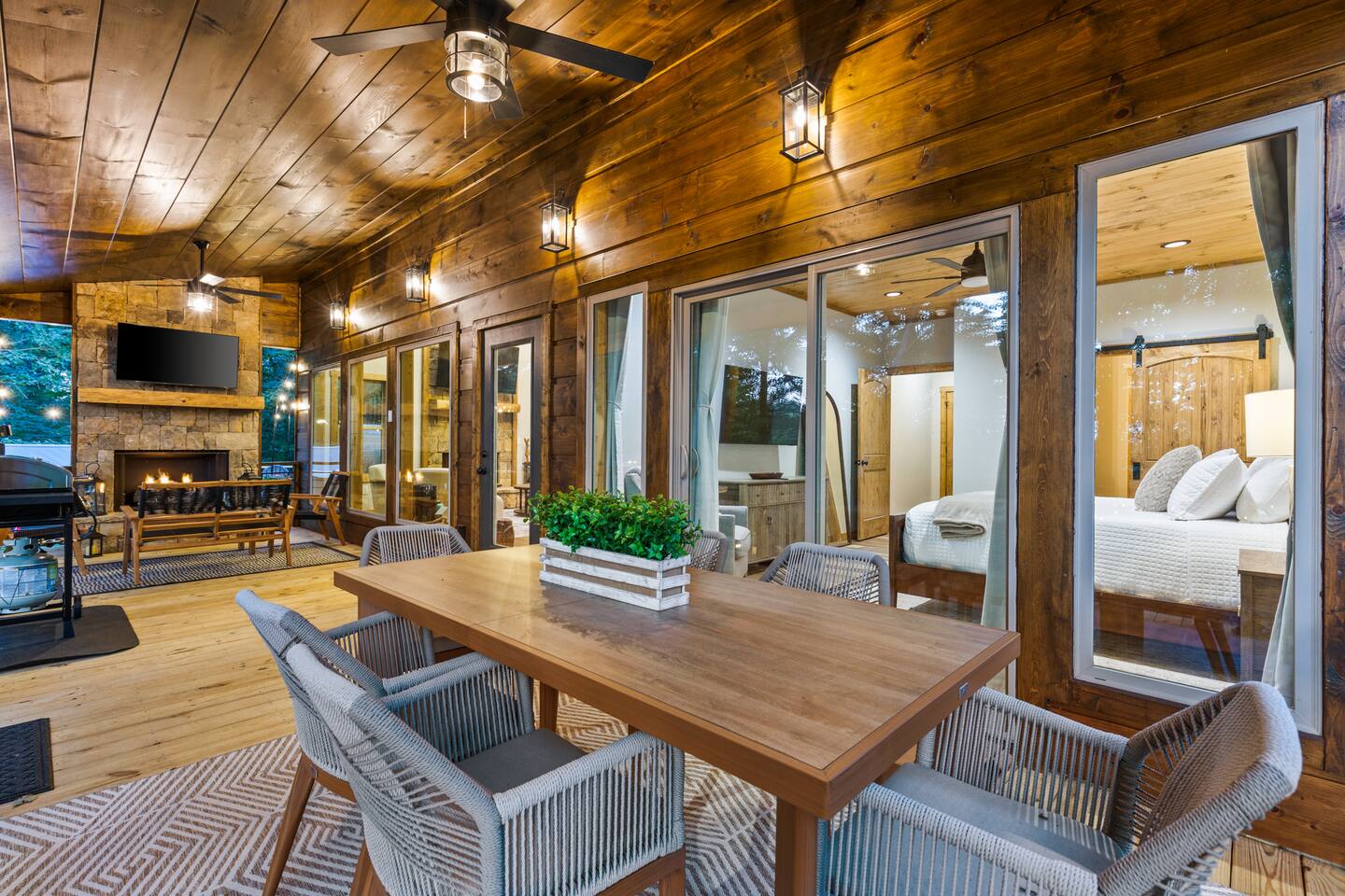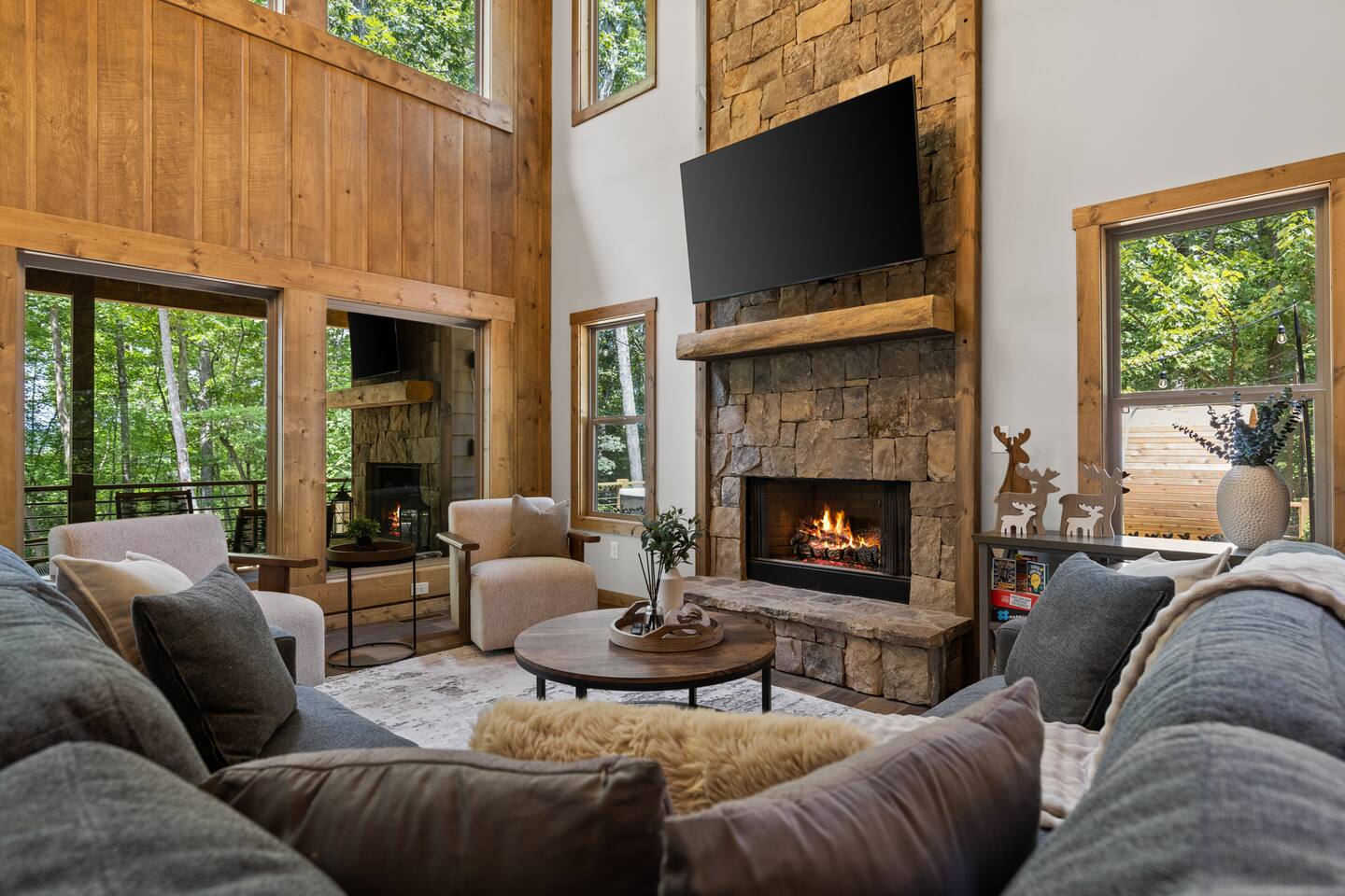 This brand-new luxury mountain retreat features 3 spacious bedrooms and 2.5 bathrooms, with comfortable sleeping arrangements including 2 king beds and 2 custom bunk beds — perfect for families, couples, or groups. Step outside to a thoughtfully designed high-end outdoor space that lets you enjoy the entire property. Cross the charming walking bridge to the fire pit, or relax on the expansive decks with a 6-person hot tub, barrel sauna, outdoor dining, fireplace lounge, and private putting green. Whether you’re gathering with loved ones or seeking new adventures, Serenity Escape offers the perfect blend of luxury and mountain adventure. Bedrooms - Bedroom 1 (First Floor – King Suite): King bed, private en-suite bathroom, and walk-in closet. Perfect for guests who prefer main-level access. - Bedroom 2 (Second Floor – King Room): King bed, dedicated workspace, walk-in closet, and access to a shared bathroom with a soaking tub and walk-in shower. - Bedroom 3 (Second Floor – Bunk Room): Two custom bunk beds, each with a full bed on the bottom, twin top bunk, and twin trundle — comfortably sleeping up to 6. Includes a cozy reading nook and shares the upstairs bathroom with Bedroom 2. Family-Friendly Amenities For our younger guests, you’ll find a high chair, booster seat, and pack ’n play in the downstairs hallway closet. The home is also equipped with children’s dishware, books, and toys to make family stays easy and fun. Back Porch and Amenities Deck The spacious back porch is the perfect place to relax and gather. Enjoy outdoor dining, fire up the gas grill with a full grilling set, or unwind in the beautiful lounge area in front of the outdoor fireplace with mounted TV — ideal for watching movies or catching the big game. Step onto the amenities deck along the side of the house, designed for both relaxation and fun. Here you’ll find plenty of seating, giant Jenga and Connect 5, plus wellness and entertainment features including a 6-person hot tub, barrel sauna, and private putting green. It’s the ultimate indoor-outdoor retreat for families and friends. Fire Pit Area Cross the charming walking bridge to enter the serene firepit space, designed for relaxation and connection. Gather around the large firepit with seating for 8, perfect for roasting marshmallows or enjoying conversations under the stars. On each side of the firepit, you’ll also find two wooden double-seat swings — a cozy spot to sway and soak in the mountain atmosphere. Location Serenity Escape is ideally located just 10 minutes from downtown Ellijay and 25 minutes from downtown Blue Ridge, giving you easy access to restaurants, wineries, apple orchards, hiking, horseback riding, and more. The cabin is nestled inside the gated Coosawattee River Resort, where guests enjoy complimentary access to resort-style amenities, including: - Tennis & pickleball courts - Indoor and outdoor swimming pools - Mini golf & arcade room - Fitness center - Fishing ponds & river access Whether you’re looking for outdoor adventure, family fun, or a relaxing wine country escape, this location puts it all within reach. Entertainment & TVs All TVs in the cabin are smart TVs with free access to movies, news, sports, and entertainment through Samsung TV Plus. Guests can also log in to their own streaming accounts such as Netflix, Hulu, Prime Video, Disney+, and more. Check out the house welcome book on the entry way piece to learn more about our property and local recommendations!