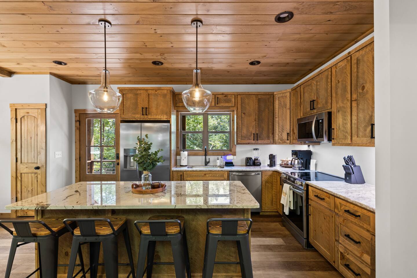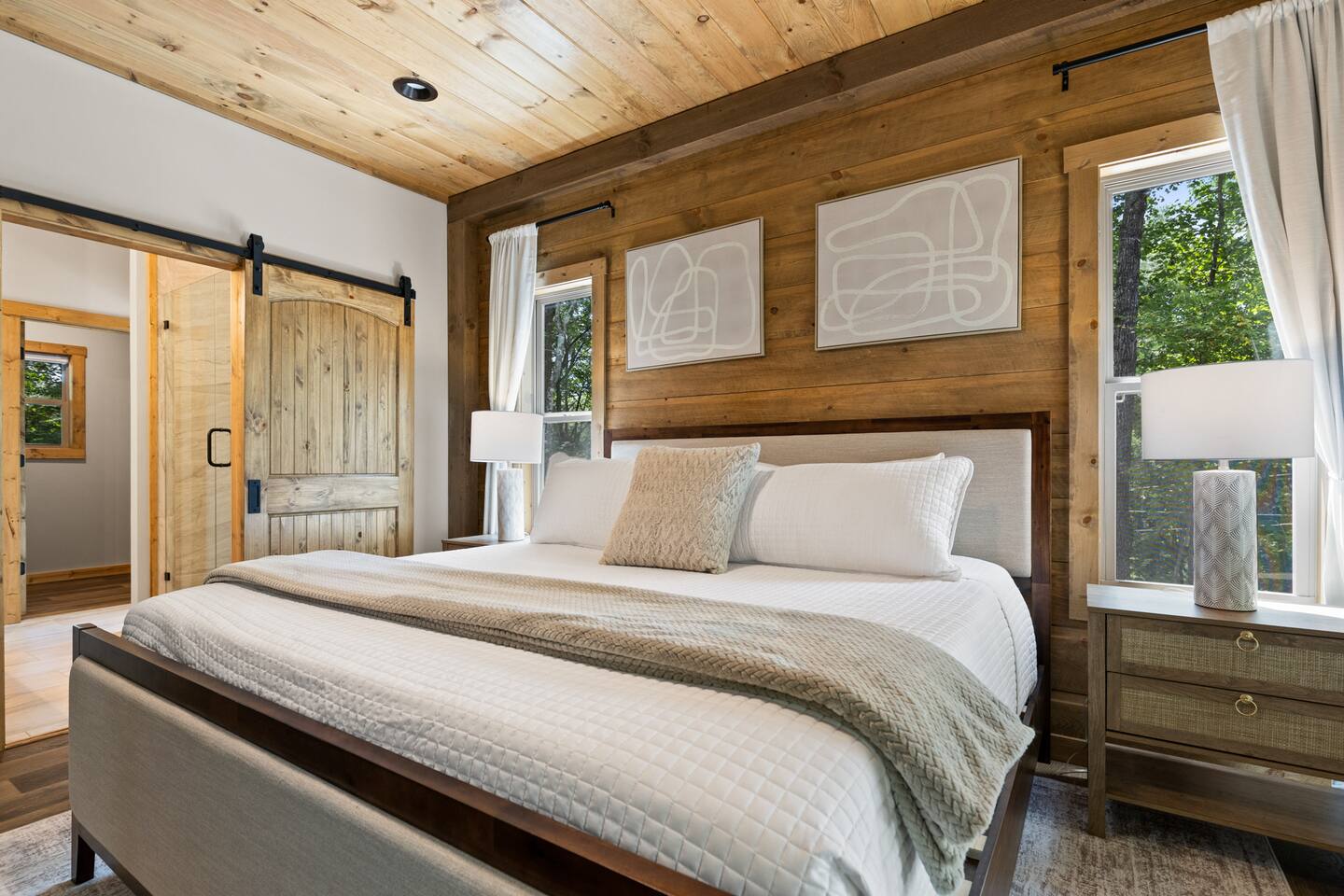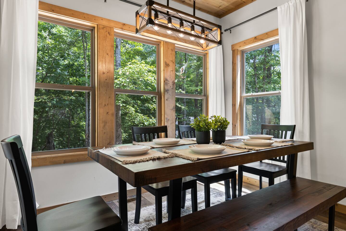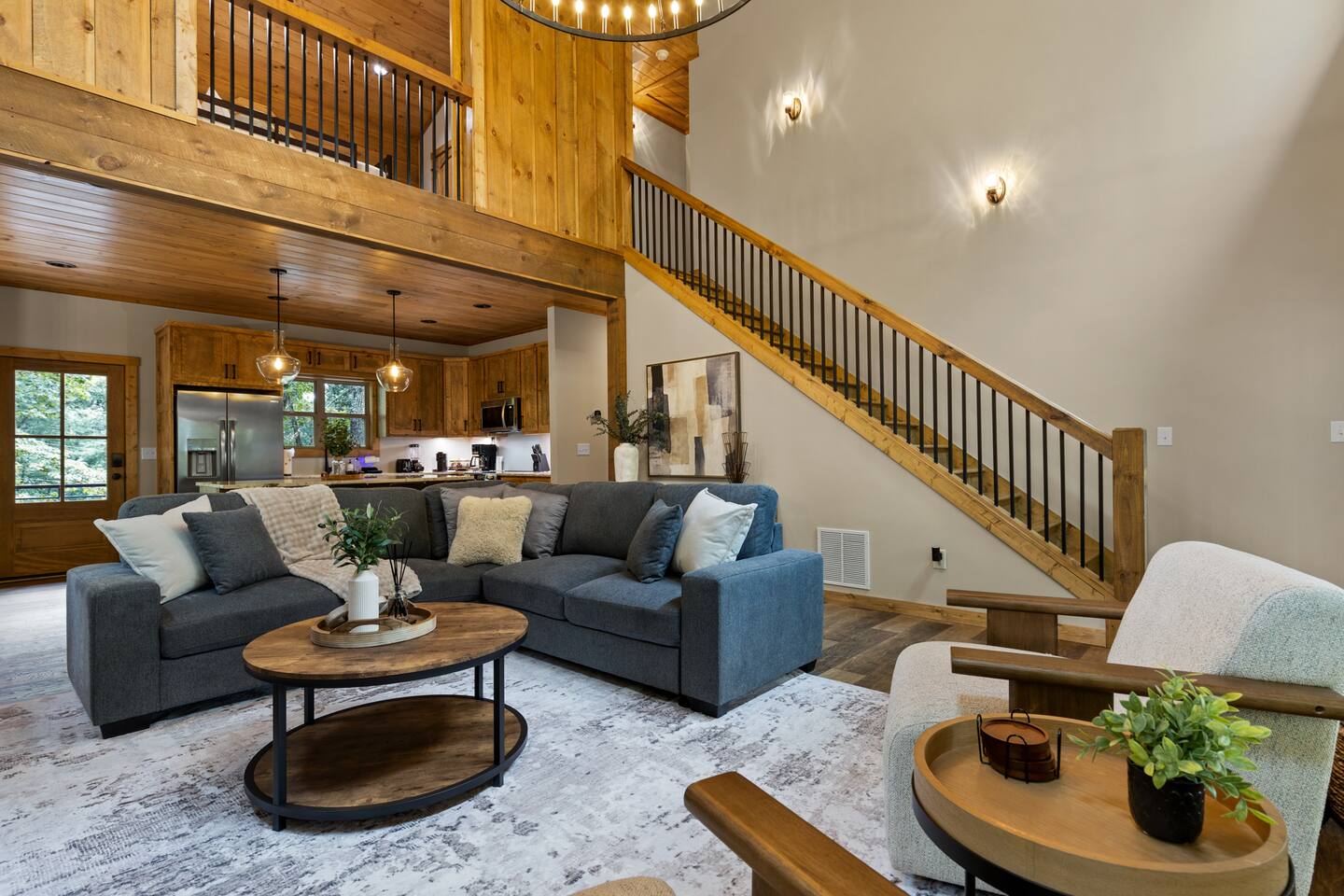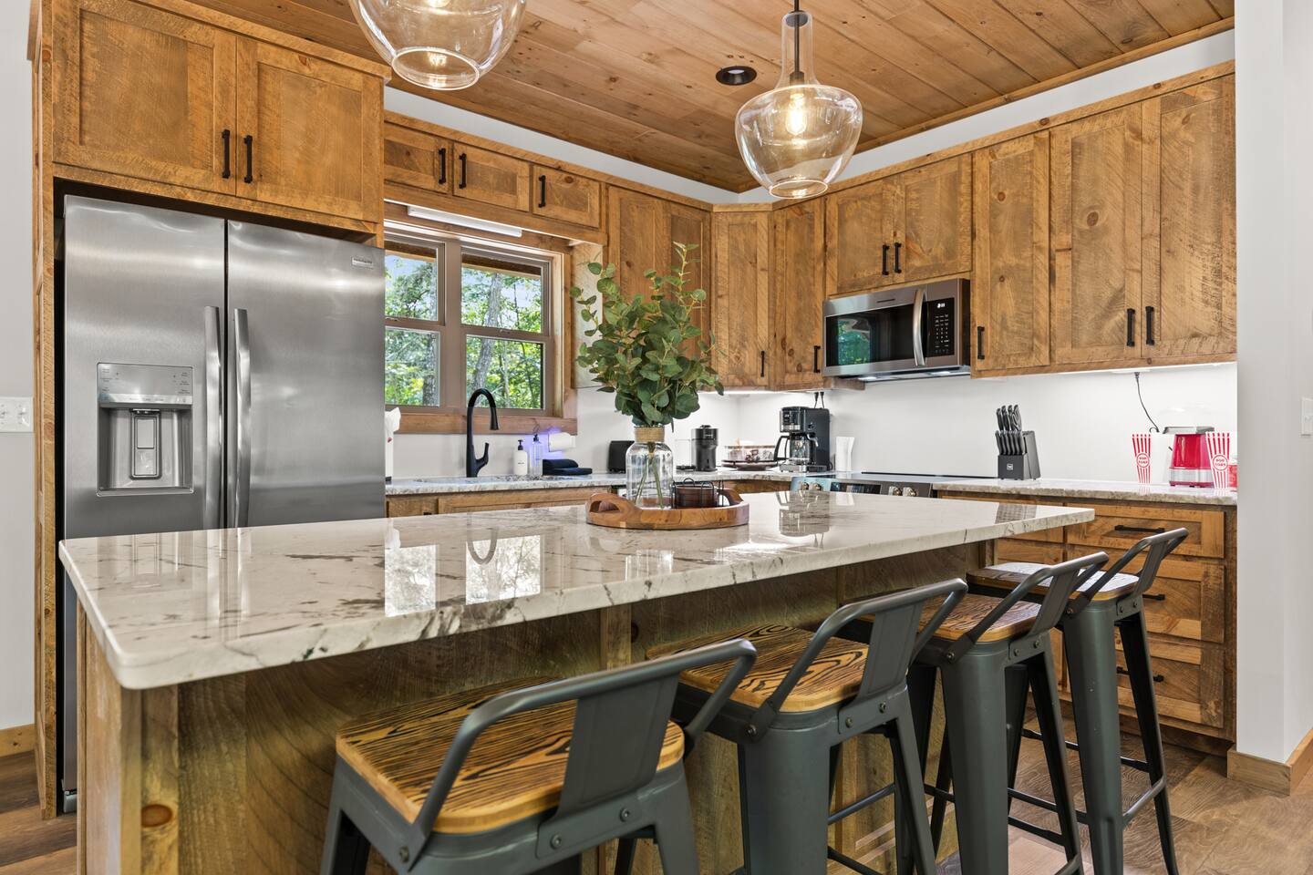 This brand-new luxury mountain retreat features 3 spacious bedrooms and 2.5 bathrooms, with comfortable sleeping arrangements including 2 king beds and 2 custom bunk beds — perfect for families, couples, or groups. Step outside to a thoughtfully designed high-end outdoor space that lets you enjoy the entire property. Cross the charming walking bridge to the fire pit, or relax on the expansive decks with a 6-person hot tub, barrel sauna, outdoor dining, fireplace lounge, and private putting green. Whether you’re gathering with loved ones or seeking new adventures, Serenity Escape offers the perfect blend of luxury and mountain adventure. Bedrooms - Bedroom 1 (First Floor – King Suite): King bed, private en-suite bathroom, and walk-in closet. Perfect for guests who prefer main-level access. - Bedroom 2 (Second Floor – King Room): King bed, dedicated workspace, walk-in closet, and access to a shared bathroom with a soaking tub and walk-in shower. - Bedroom 3 (Second Floor – Bunk Room): Two custom bunk beds, each with a full bed on the bottom, twin top bunk, and twin trundle — comfortably sleeping up to 6. Includes a cozy reading nook and shares the upstairs bathroom with Bedroom 2. Family-Friendly Amenities For our younger guests, you’ll find a high chair, booster seat, and pack ’n play in the downstairs hallway closet. The home is also equipped with children’s dishware, books, and toys to make family stays easy and fun. Back Porch and Amenities Deck The spacious back porch is the perfect place to relax and gather. Enjoy outdoor dining, fire up the gas grill with a full grilling set, or unwind in the beautiful lounge area in front of the outdoor fireplace with mounted TV — ideal for watching movies or catching the big game. Step onto the amenities deck along the side of the house, designed for both relaxation and fun. Here you’ll find plenty of seating, giant Jenga and Connect 5, plus wellness and entertainment features including a 6-person hot tub, barrel sauna, and private putting green. It’s the ultimate indoor-outdoor retreat for families and friends. Fire Pit Area Cross the charming walking bridge to enter the serene firepit space, designed for relaxation and connection. Gather around the large firepit with seating for 8, perfect for roasting marshmallows or enjoying conversations under the stars. On each side of the firepit, you’ll also find two wooden double-seat swings — a cozy spot to sway and soak in the mountain atmosphere. Location Serenity Escape is ideally located just 10 minutes from downtown Ellijay and 25 minutes from downtown Blue Ridge, giving you easy access to restaurants, wineries, apple orchards, hiking, horseback riding, and more. The cabin is nestled inside the gated Coosawattee River Resort, where guests enjoy complimentary access to resort-style amenities, including: - Tennis & pickleball courts - Indoor and outdoor swimming pools - Mini golf & arcade room - Fitness center - Fishing ponds & river access Whether you’re looking for outdoor adventure, family fun, or a relaxing wine country escape, this location puts it all within reach. Entertainment & TVs All TVs in the cabin are smart TVs with free access to movies, news, sports, and entertainment through Samsung TV Plus. Guests can also log in to their own streaming accounts such as Netflix, Hulu, Prime Video, Disney+, and more. Check out the house welcome book on the entry way piece to learn more about our property and local recommendations!