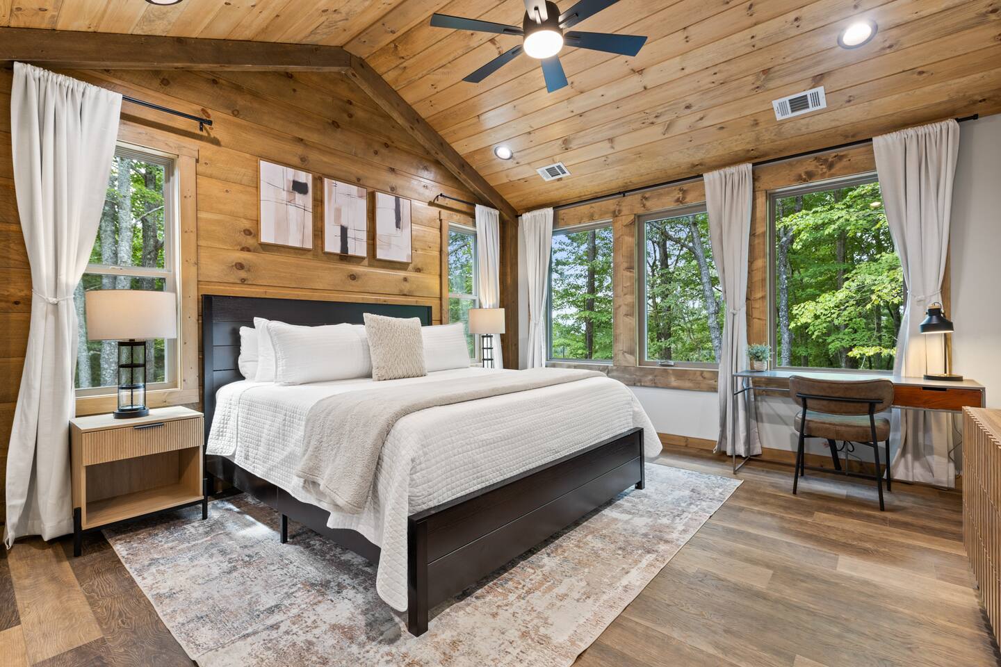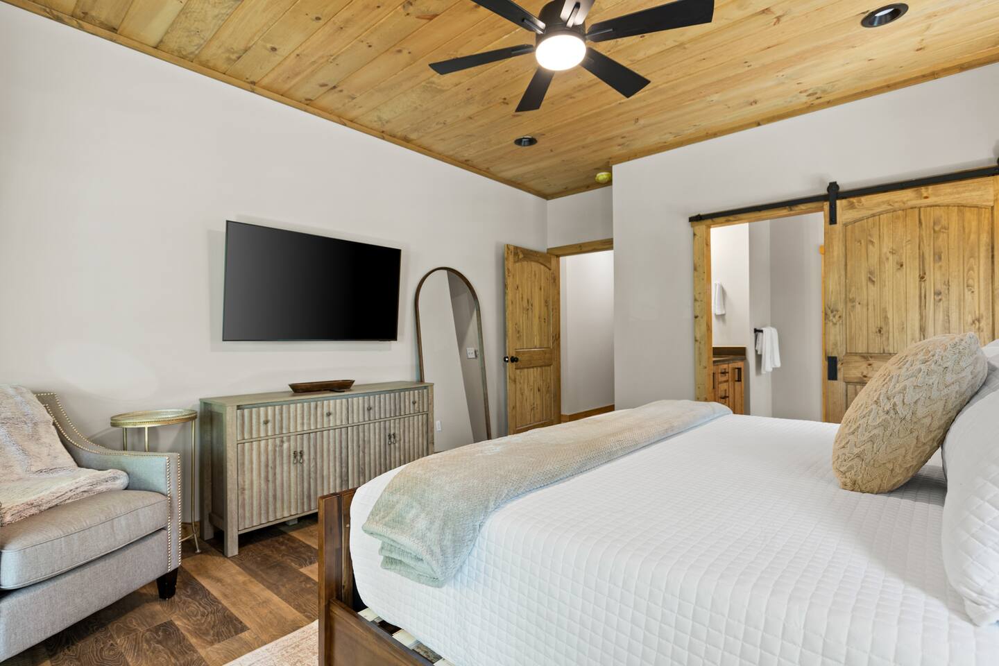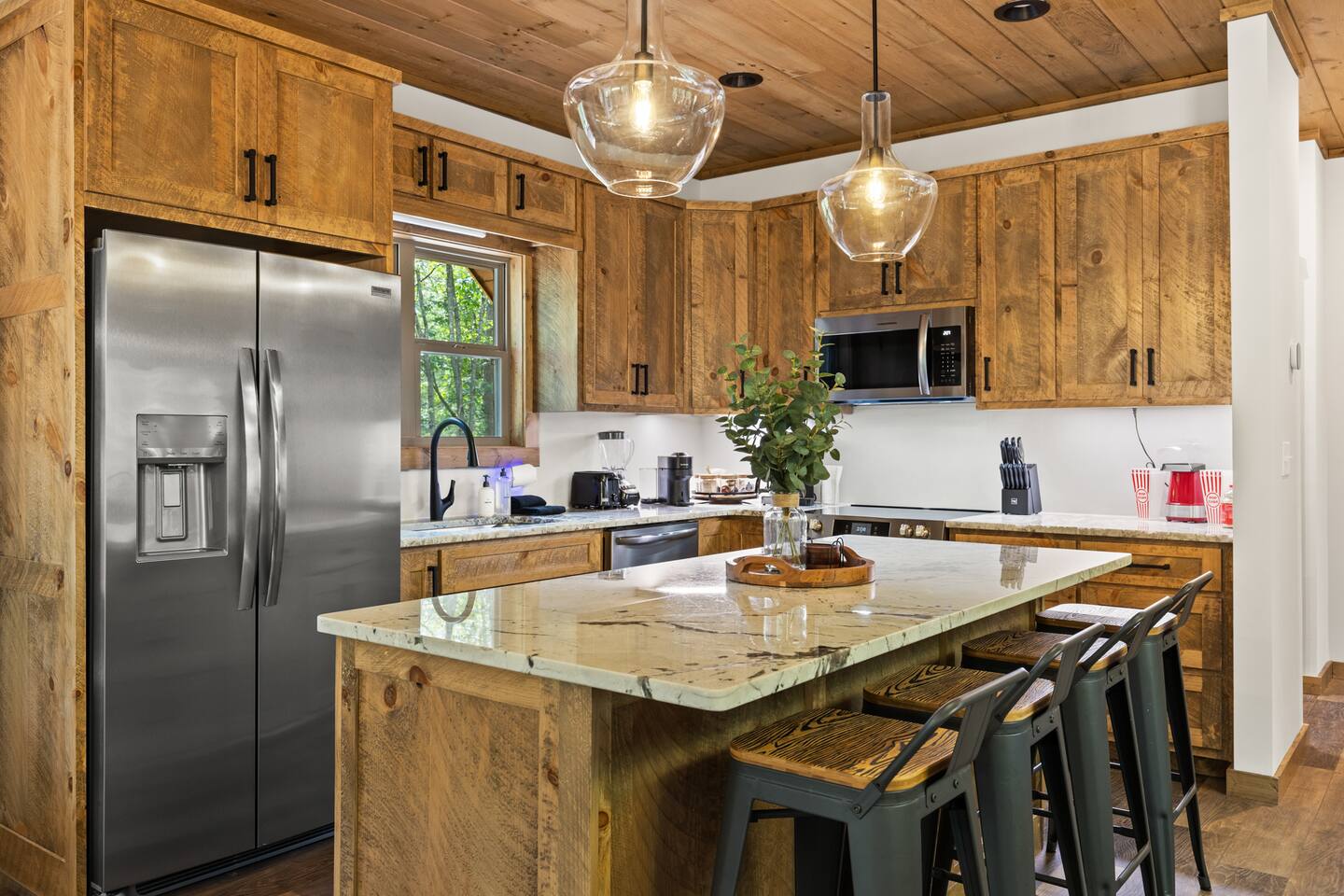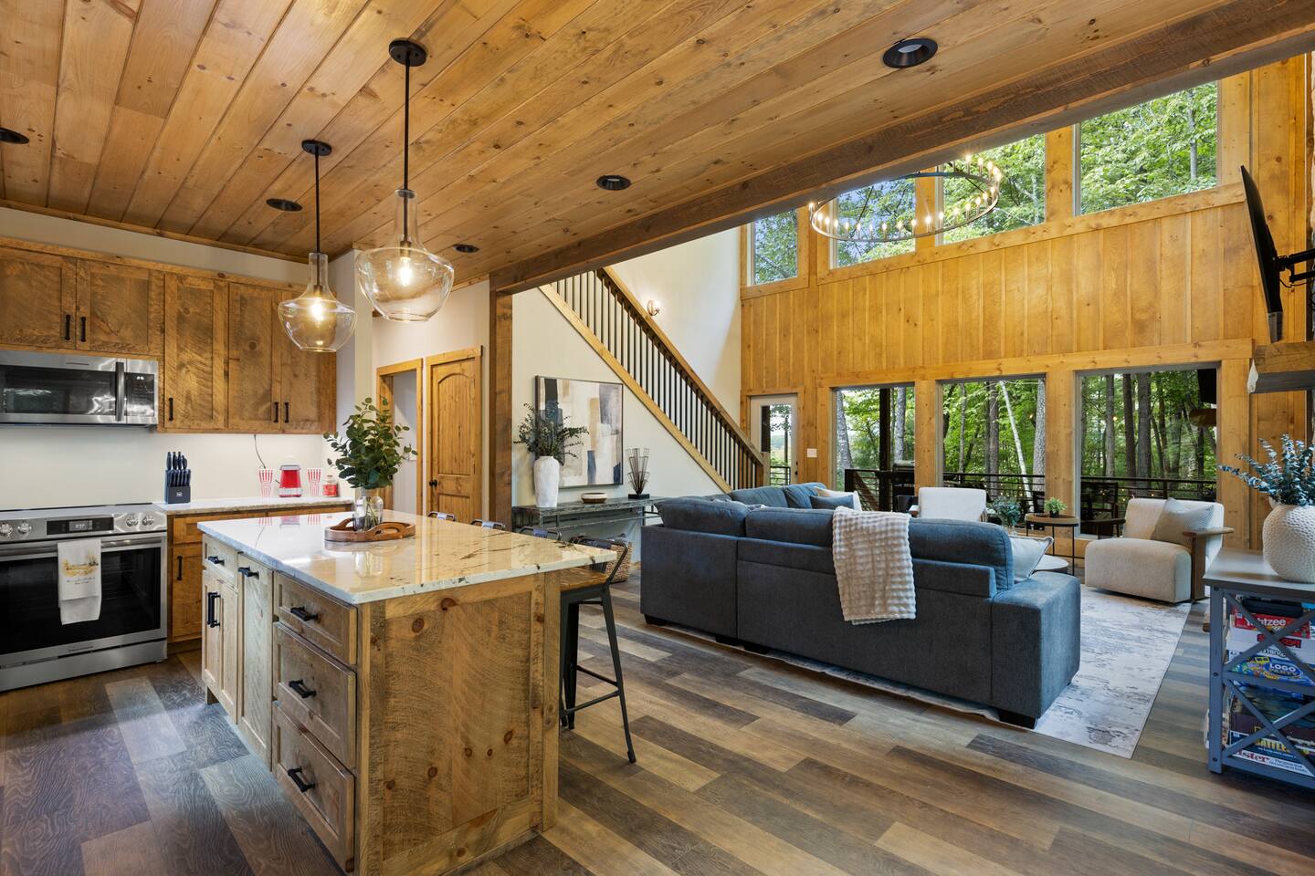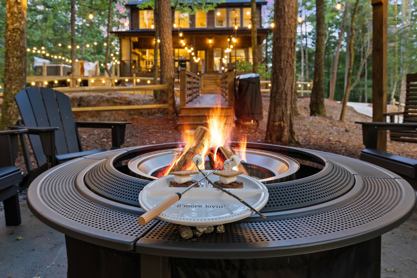 This brand-new luxury mountain retreat features 3 spacious bedrooms and 2.5 bathrooms, with comfortable sleeping arrangements including 2 king beds and 2 custom bunk beds — perfect for families, couples, or groups. Step outside to a thoughtfully designed high-end outdoor space that lets you enjoy the entire property. Cross the charming walking bridge to the fire pit, or relax on the expansive decks with a 6-person hot tub, barrel sauna, outdoor dining, fireplace lounge, and private putting green. Whether you’re gathering with loved ones or seeking new adventures, Serenity Escape offers the perfect blend of luxury and mountain adventure. Bedrooms - Bedroom 1 (First Floor – King Suite): King bed, private en-suite bathroom, and walk-in closet. Perfect for guests who prefer main-level access. - Bedroom 2 (Second Floor – King Room): King bed, dedicated workspace, walk-in closet, and access to a shared bathroom with a soaking tub and walk-in shower. - Bedroom 3 (Second Floor – Bunk Room): Two custom bunk beds, each with a full bed on the bottom, twin top bunk, and twin trundle — comfortably sleeping up to 6. Includes a cozy reading nook and shares the upstairs bathroom with Bedroom 2. Family-Friendly Amenities For our younger guests, you’ll find a high chair, booster seat, and pack ’n play in the downstairs hallway closet. The home is also equipped with children’s dishware, books, and toys to make family stays easy and fun. Back Porch and Amenities Deck The spacious back porch is the perfect place to relax and gather. Enjoy outdoor dining, fire up the gas grill with a full grilling set, or unwind in the beautiful lounge area in front of the outdoor fireplace with mounted TV — ideal for watching movies or catching the big game. Step onto the amenities deck along the side of the house, designed for both relaxation and fun. Here you’ll find plenty of seating, giant Jenga and Connect 5, plus wellness and entertainment features including a 6-person hot tub, barrel sauna, and private putting green. It’s the ultimate indoor-outdoor retreat for families and friends. Fire Pit Area Cross the charming walking bridge to enter the serene firepit space, designed for relaxation and connection. Gather around the large firepit with seating for 8, perfect for roasting marshmallows or enjoying conversations under the stars. On each side of the firepit, you’ll also find two wooden double-seat swings — a cozy spot to sway and soak in the mountain atmosphere. Location Serenity Escape is ideally located just 10 minutes from downtown Ellijay and 25 minutes from downtown Blue Ridge, giving you easy access to restaurants, wineries, apple orchards, hiking, horseback riding, and more. The cabin is nestled inside the gated Coosawattee River Resort, where guests enjoy complimentary access to resort-style amenities, including: - Tennis & pickleball courts - Indoor and outdoor swimming pools - Mini golf & arcade room - Fitness center - Fishing ponds & river access Whether you’re looking for outdoor adventure, family fun, or a relaxing wine country escape, this location puts it all within reach. Entertainment & TVs All TVs in the cabin are smart TVs with free access to movies, news, sports, and entertainment through Samsung TV Plus. Guests can also log in to their own streaming accounts such as Netflix, Hulu, Prime Video, Disney+, and more. Check out the house welcome book on the entry way piece to learn more about our property and local recommendations!