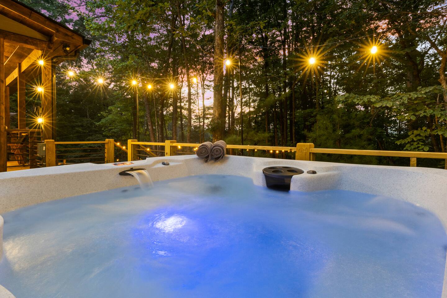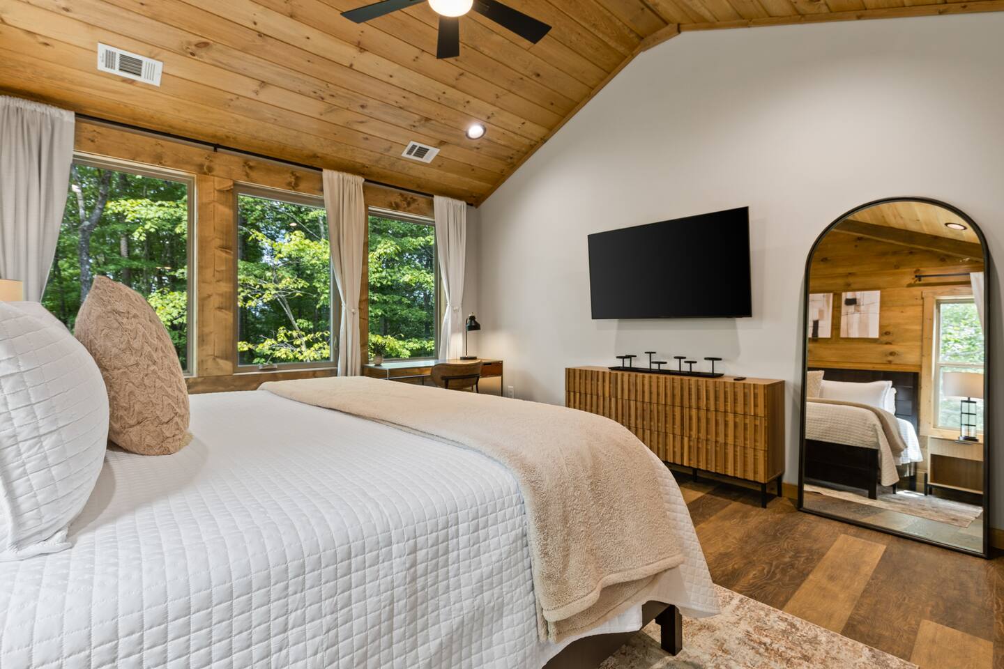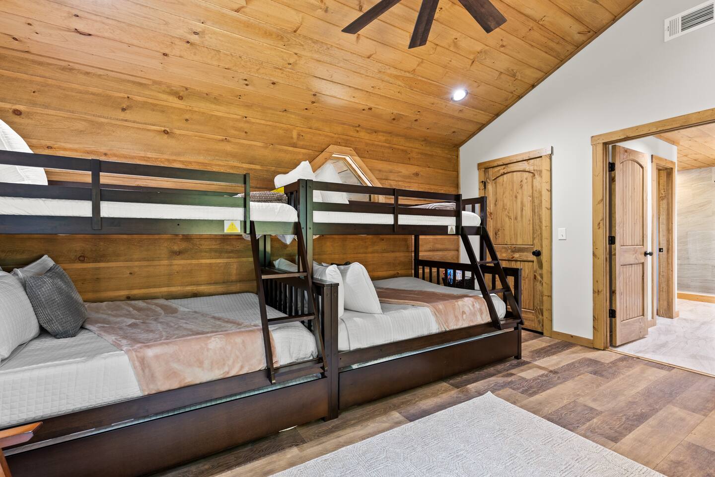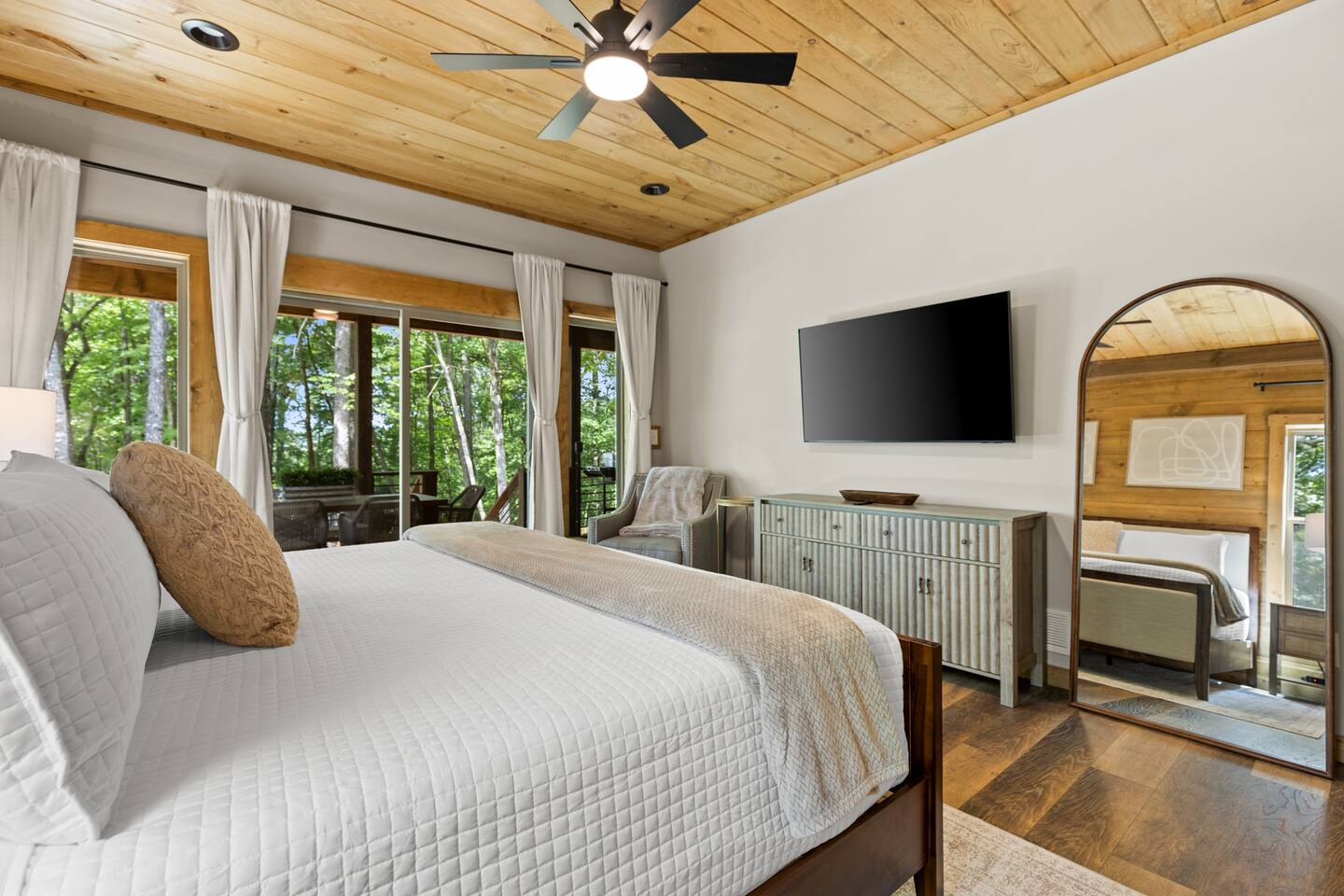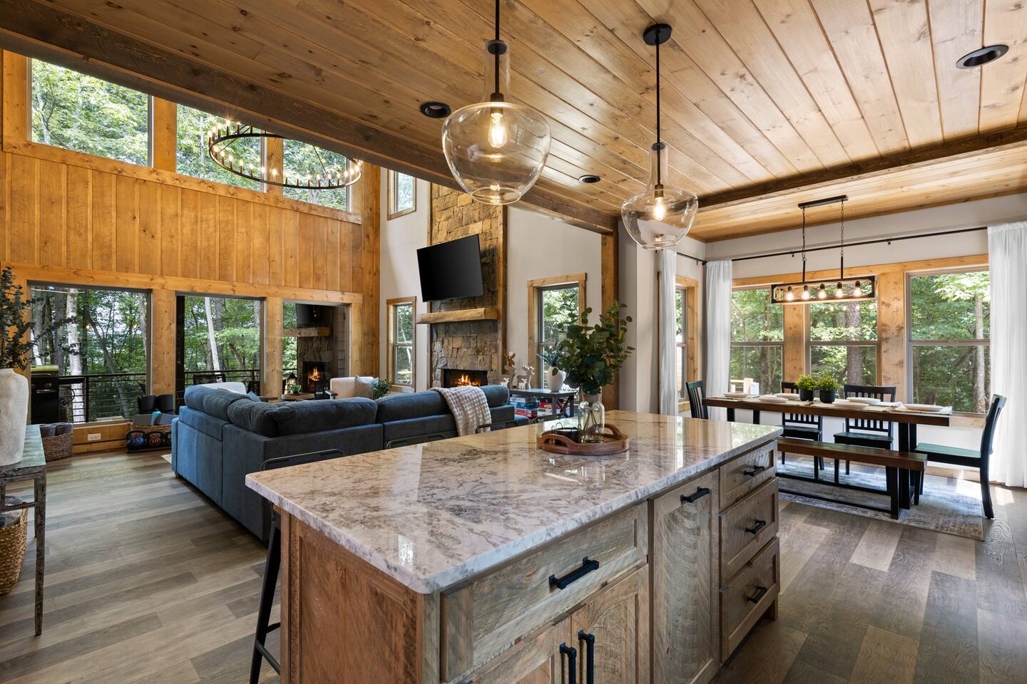 This brand-new luxury mountain retreat features 3 spacious bedrooms and 2.5 bathrooms, with comfortable sleeping arrangements including 2 king beds and 2 custom bunk beds — perfect for families, couples, or groups. Step outside to a thoughtfully designed high-end outdoor space that lets you enjoy the entire property. Cross the charming walking bridge to the fire pit, or relax on the expansive decks with a 6-person hot tub, barrel sauna, outdoor dining, fireplace lounge, and private putting green. Whether you’re gathering with loved ones or seeking new adventures, Serenity Escape offers the perfect blend of luxury and mountain adventure. Bedrooms - Bedroom 1 (First Floor – King Suite): King bed, private en-suite bathroom, and walk-in closet. Perfect for guests who prefer main-level access. - Bedroom 2 (Second Floor – King Room): King bed, dedicated workspace, walk-in closet, and access to a shared bathroom with a soaking tub and walk-in shower. - Bedroom 3 (Second Floor – Bunk Room): Two custom bunk beds, each with a full bed on the bottom, twin top bunk, and twin trundle — comfortably sleeping up to 6. Includes a cozy reading nook and shares the upstairs bathroom with Bedroom 2. Family-Friendly Amenities For our younger guests, you’ll find a high chair, booster seat, and pack ’n play in the downstairs hallway closet. The home is also equipped with children’s dishware, books, and toys to make family stays easy and fun. Back Porch and Amenities Deck The spacious back porch is the perfect place to relax and gather. Enjoy outdoor dining, fire up the gas grill with a full grilling set, or unwind in the beautiful lounge area in front of the outdoor fireplace with mounted TV — ideal for watching movies or catching the big game. Step onto the amenities deck along the side of the house, designed for both relaxation and fun. Here you’ll find plenty of seating, giant Jenga and Connect 5, plus wellness and entertainment features including a 6-person hot tub, barrel sauna, and private putting green. It’s the ultimate indoor-outdoor retreat for families and friends. Fire Pit Area Cross the charming walking bridge to enter the serene firepit space, designed for relaxation and connection. Gather around the large firepit with seating for 8, perfect for roasting marshmallows or enjoying conversations under the stars. On each side of the firepit, you’ll also find two wooden double-seat swings — a cozy spot to sway and soak in the mountain atmosphere. Location Serenity Escape is ideally located just 10 minutes from downtown Ellijay and 25 minutes from downtown Blue Ridge, giving you easy access to restaurants, wineries, apple orchards, hiking, horseback riding, and more. The cabin is nestled inside the gated Coosawattee River Resort, where guests enjoy complimentary access to resort-style amenities, including: - Tennis & pickleball courts - Indoor and outdoor swimming pools - Mini golf & arcade room - Fitness center - Fishing ponds & river access Whether you’re looking for outdoor adventure, family fun, or a relaxing wine country escape, this location puts it all within reach. Entertainment & TVs All TVs in the cabin are smart TVs with free access to movies, news, sports, and entertainment through Samsung TV Plus. Guests can also log in to their own streaming accounts such as Netflix, Hulu, Prime Video, Disney+, and more. Check out the house welcome book on the entry way piece to learn more about our property and local recommendations!