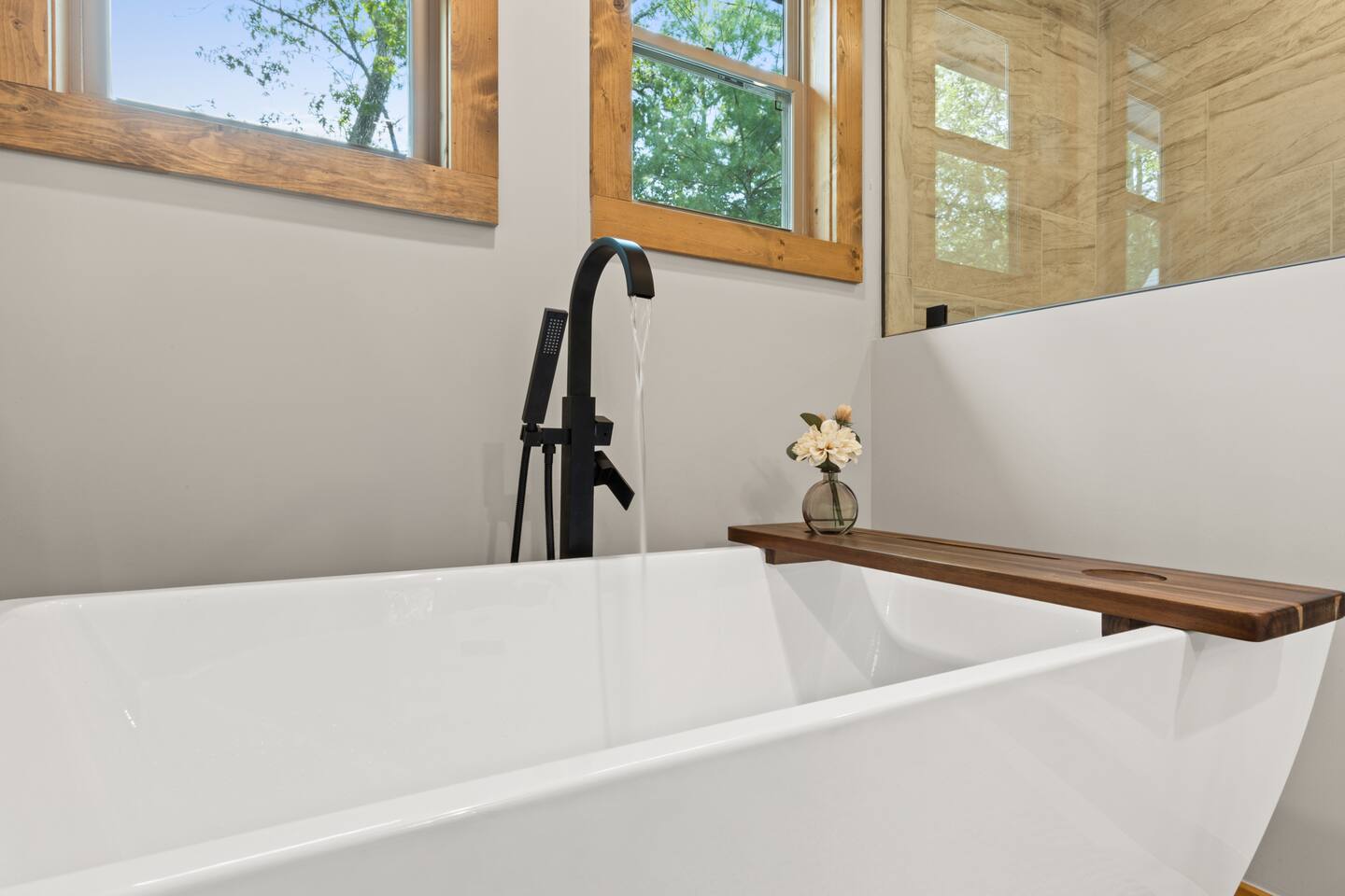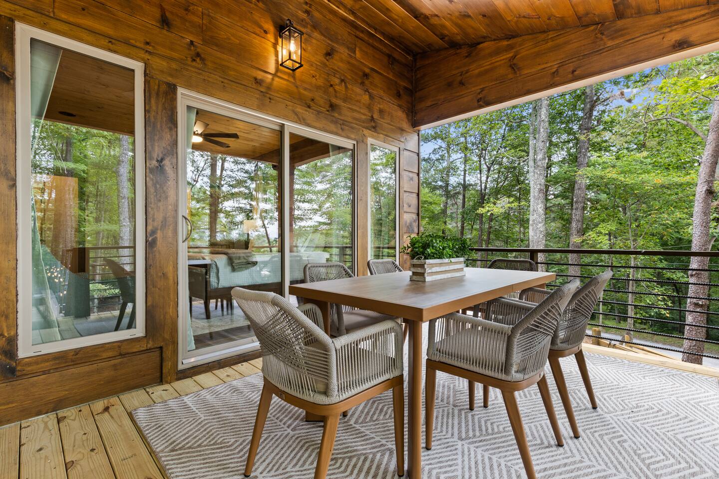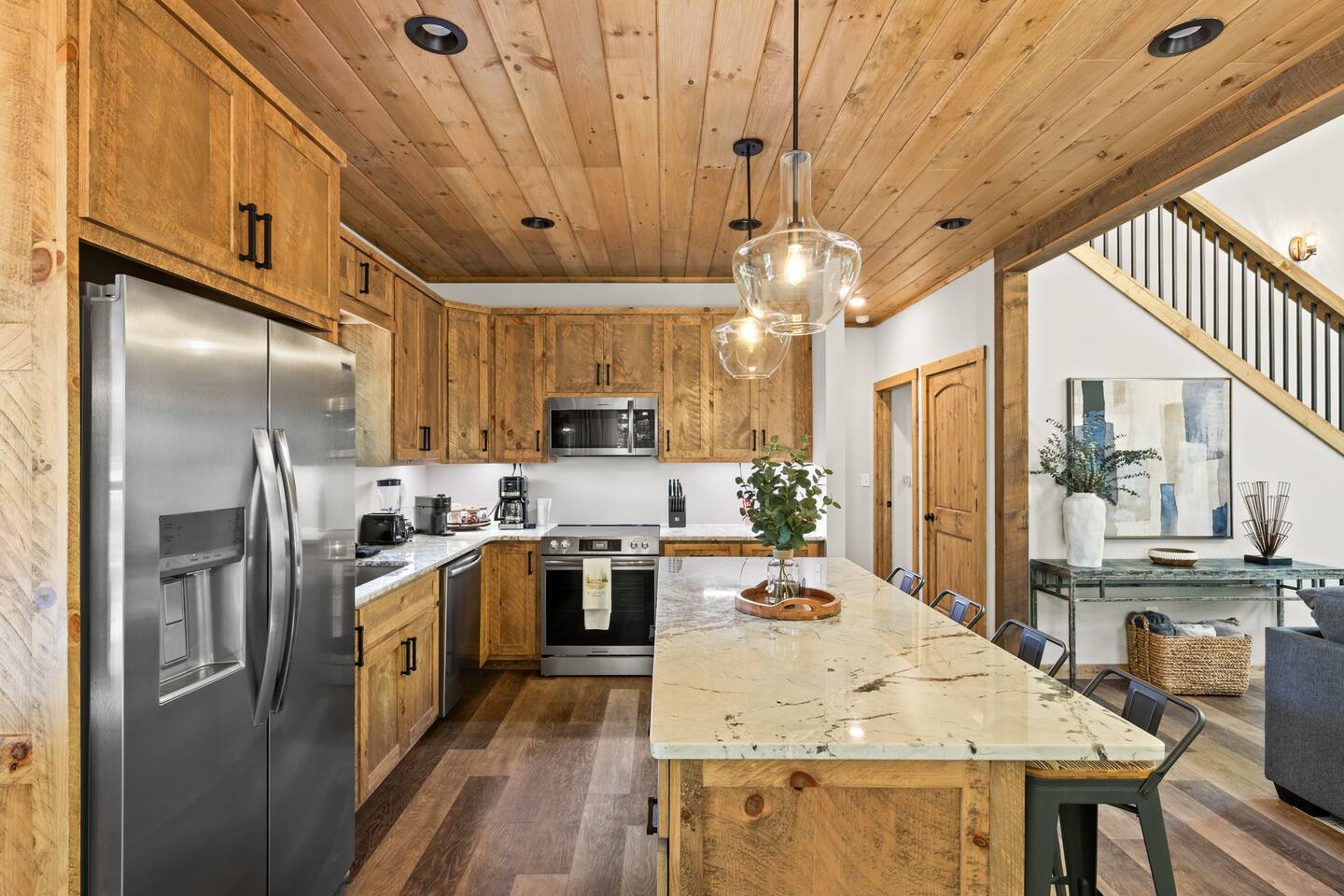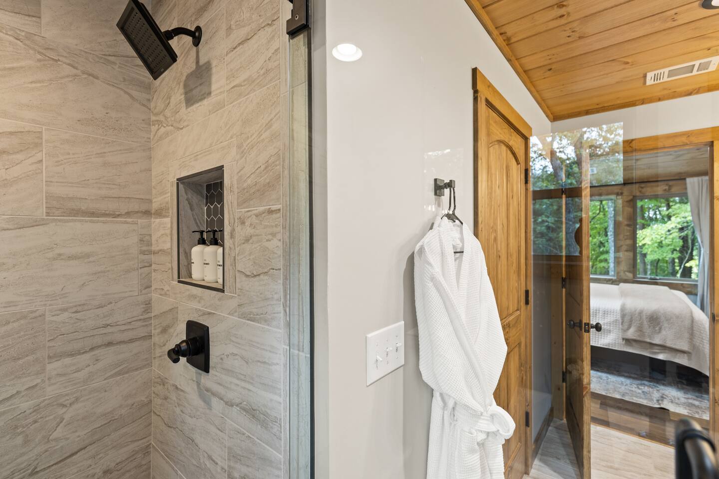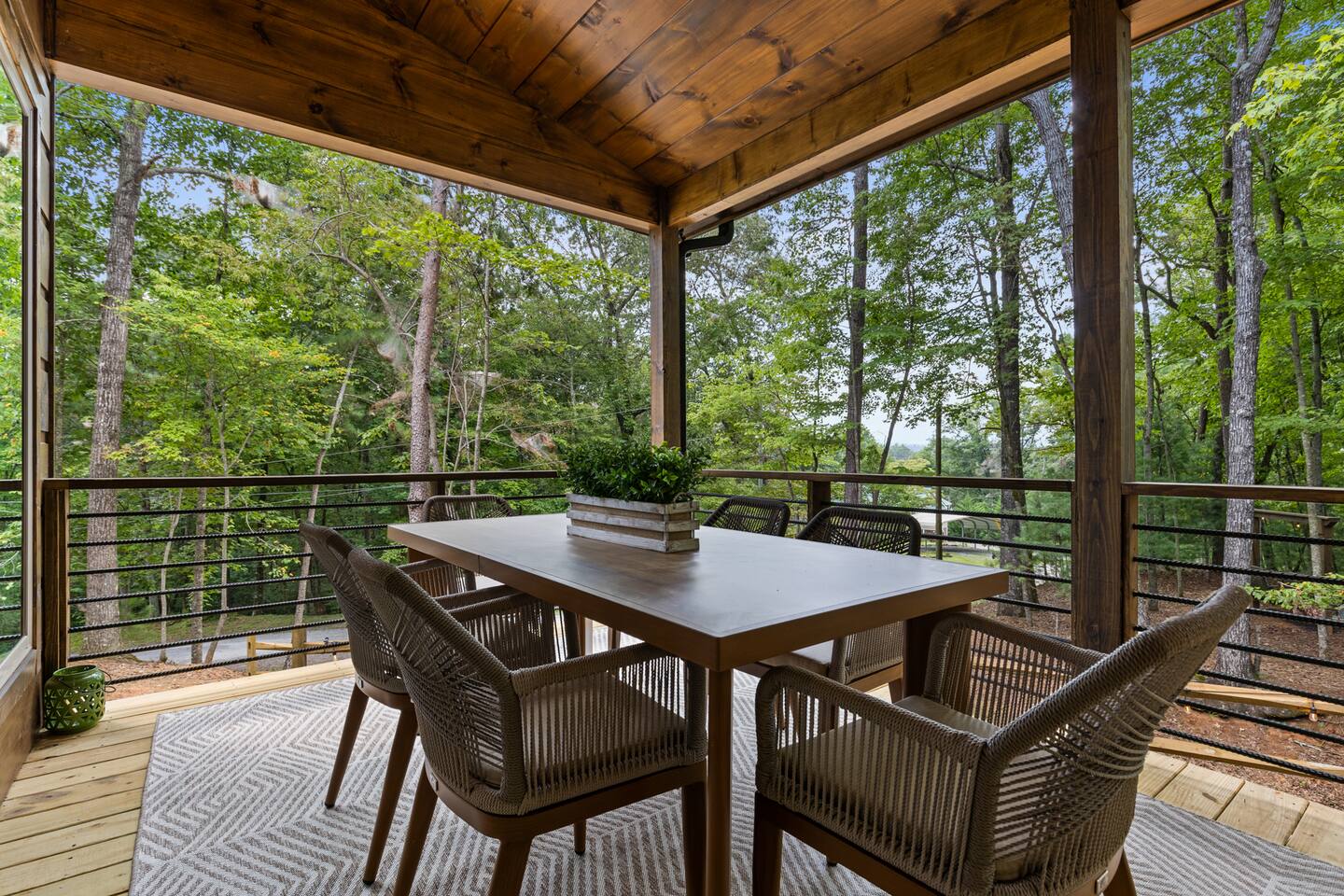 This brand-new luxury mountain retreat features 3 spacious bedrooms and 2.5 bathrooms, with comfortable sleeping arrangements including 2 king beds and 2 custom bunk beds — perfect for families, couples, or groups. Step outside to a thoughtfully designed high-end outdoor space that lets you enjoy the entire property. Cross the charming walking bridge to the fire pit, or relax on the expansive decks with a 6-person hot tub, barrel sauna, outdoor dining, fireplace lounge, and private putting green. Whether you’re gathering with loved ones or seeking new adventures, Serenity Escape offers the perfect blend of luxury and mountain adventure. Bedrooms - Bedroom 1 (First Floor – King Suite): King bed, private en-suite bathroom, and walk-in closet. Perfect for guests who prefer main-level access. - Bedroom 2 (Second Floor – King Room): King bed, dedicated workspace, walk-in closet, and access to a shared bathroom with a soaking tub and walk-in shower. - Bedroom 3 (Second Floor – Bunk Room): Two custom bunk beds, each with a full bed on the bottom, twin top bunk, and twin trundle — comfortably sleeping up to 6. Includes a cozy reading nook and shares the upstairs bathroom with Bedroom 2. Family-Friendly Amenities For our younger guests, you’ll find a high chair, booster seat, and pack ’n play in the downstairs hallway closet. The home is also equipped with children’s dishware, books, and toys to make family stays easy and fun. Back Porch and Amenities Deck The spacious back porch is the perfect place to relax and gather. Enjoy outdoor dining, fire up the gas grill with a full grilling set, or unwind in the beautiful lounge area in front of the outdoor fireplace with mounted TV — ideal for watching movies or catching the big game. Step onto the amenities deck along the side of the house, designed for both relaxation and fun. Here you’ll find plenty of seating, giant Jenga and Connect 5, plus wellness and entertainment features including a 6-person hot tub, barrel sauna, and private putting green. It’s the ultimate indoor-outdoor retreat for families and friends. Fire Pit Area Cross the charming walking bridge to enter the serene firepit space, designed for relaxation and connection. Gather around the large firepit with seating for 8, perfect for roasting marshmallows or enjoying conversations under the stars. On each side of the firepit, you’ll also find two wooden double-seat swings — a cozy spot to sway and soak in the mountain atmosphere. Location Serenity Escape is ideally located just 10 minutes from downtown Ellijay and 25 minutes from downtown Blue Ridge, giving you easy access to restaurants, wineries, apple orchards, hiking, horseback riding, and more. The cabin is nestled inside the gated Coosawattee River Resort, where guests enjoy complimentary access to resort-style amenities, including: - Tennis & pickleball courts - Indoor and outdoor swimming pools - Mini golf & arcade room - Fitness center - Fishing ponds & river access Whether you’re looking for outdoor adventure, family fun, or a relaxing wine country escape, this location puts it all within reach. Entertainment & TVs All TVs in the cabin are smart TVs with free access to movies, news, sports, and entertainment through Samsung TV Plus. Guests can also log in to their own streaming accounts such as Netflix, Hulu, Prime Video, Disney+, and more. Check out the house welcome book on the entry way piece to learn more about our property and local recommendations!