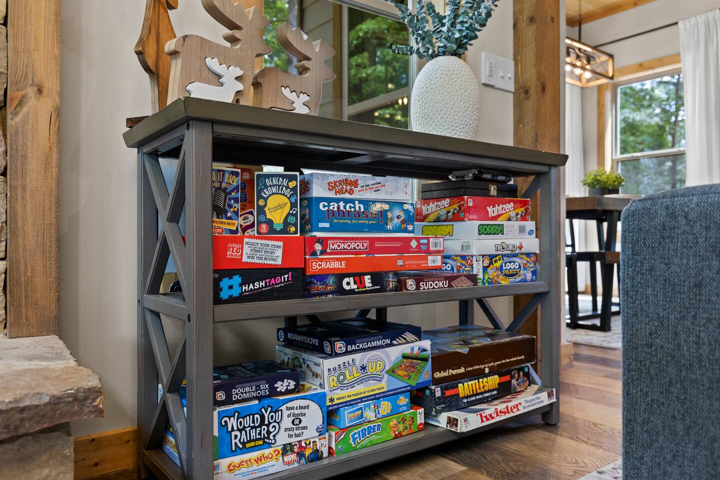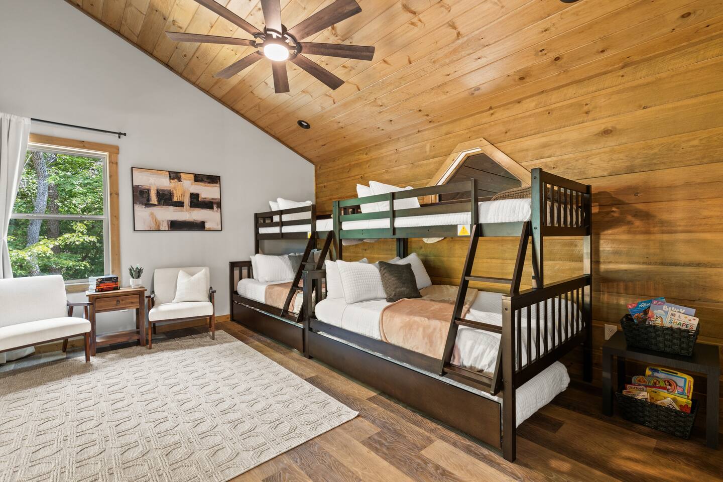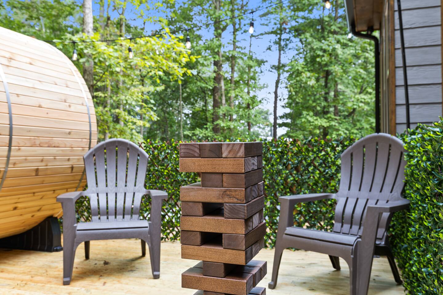 Welcome to Serenity Escape – A Stay Luxe Retreats Property. Amenities -6-person hot tub & Barrel sauna -Fire pit -Putting green & Outdoor dining area, fireplace lounge area, gas grill, smart tv Games and Equipment -Yoga equipment & kettlebells - Connect 4 & Giant Jenga & Cornhole - Tons of card/board games - Kids book and toy bin, high chair, booster seat, and pack n’ play Sleeping -2 kings suites -1 bunkroom 2 sets of: twin beds, full beds, trundle twin beds Fully stocked kitchen